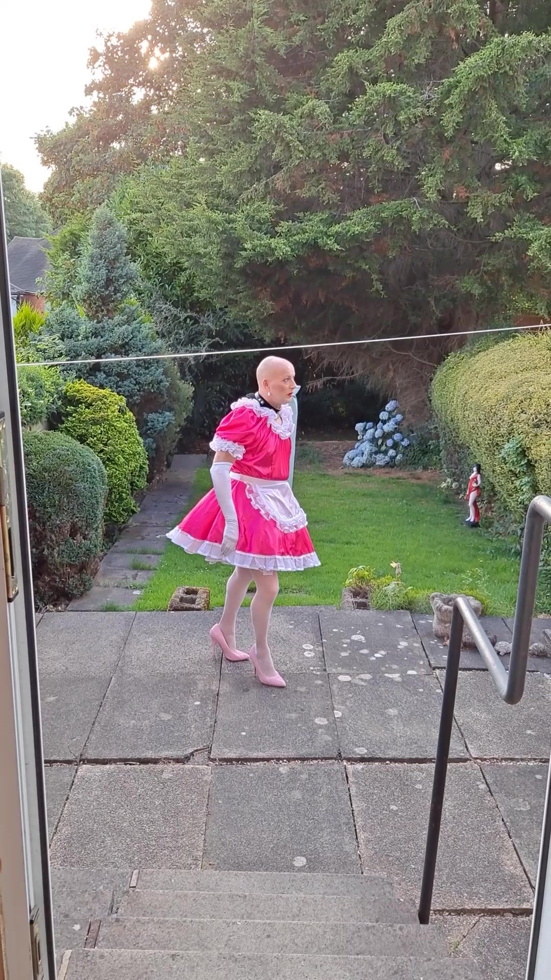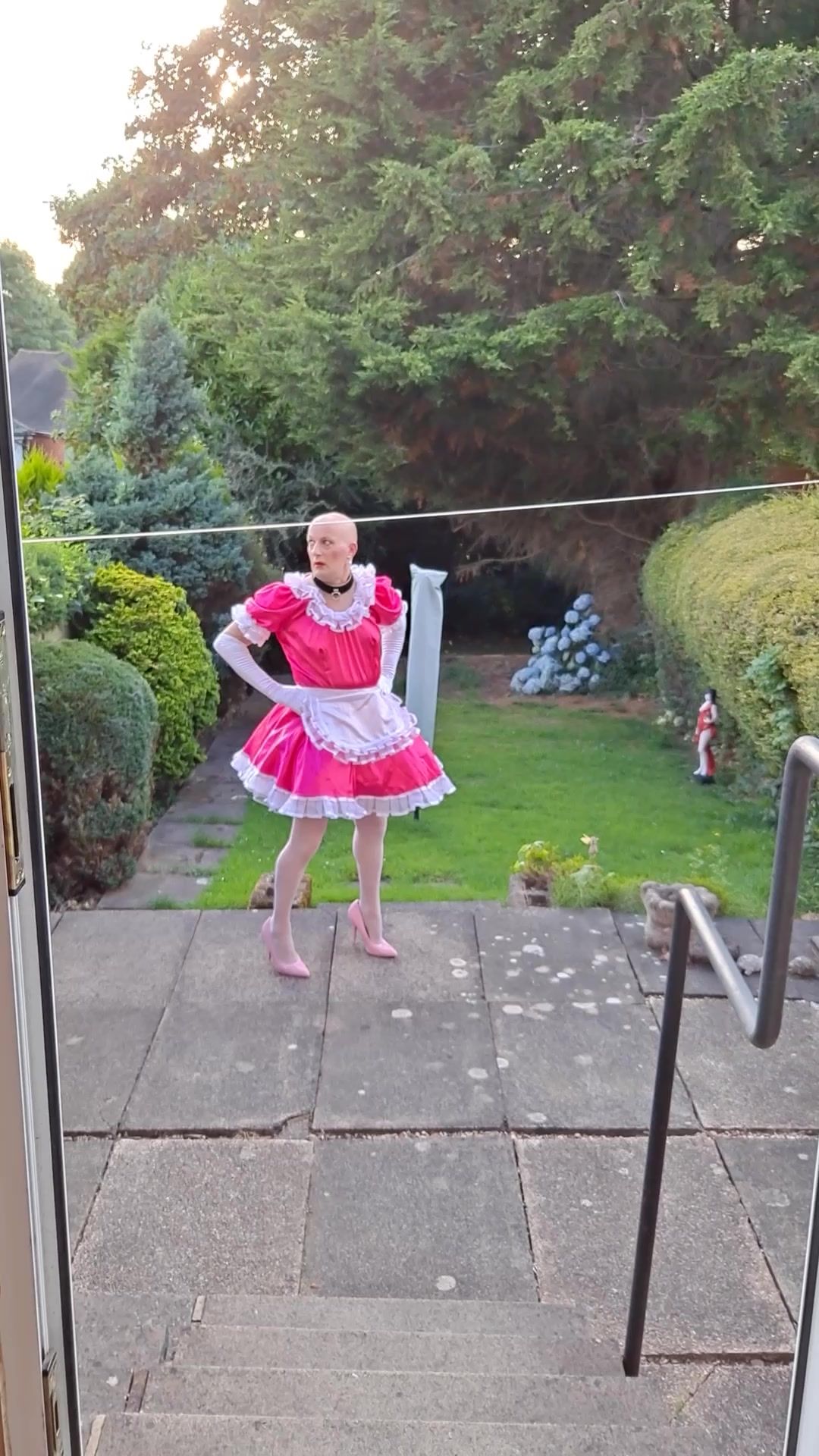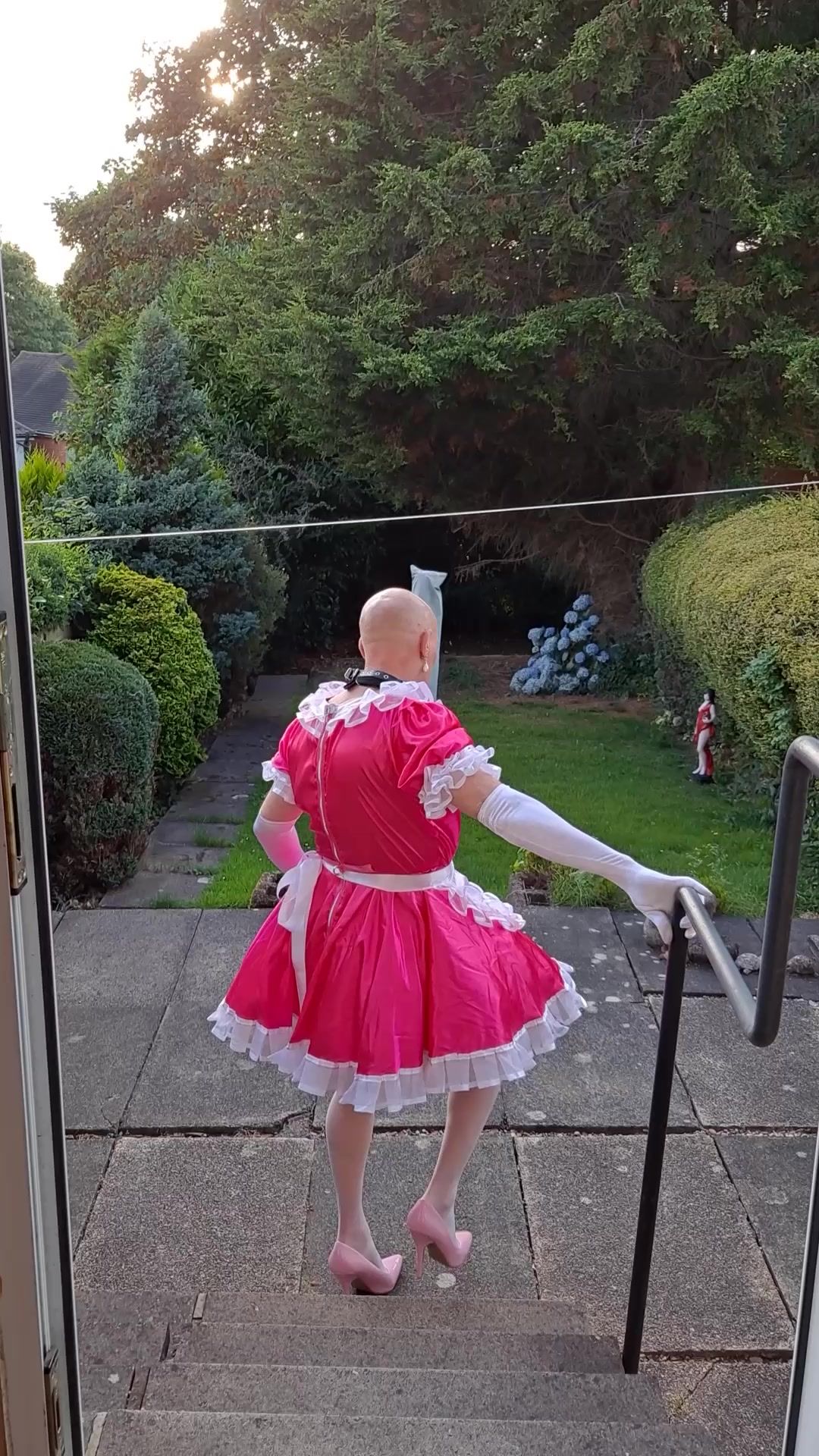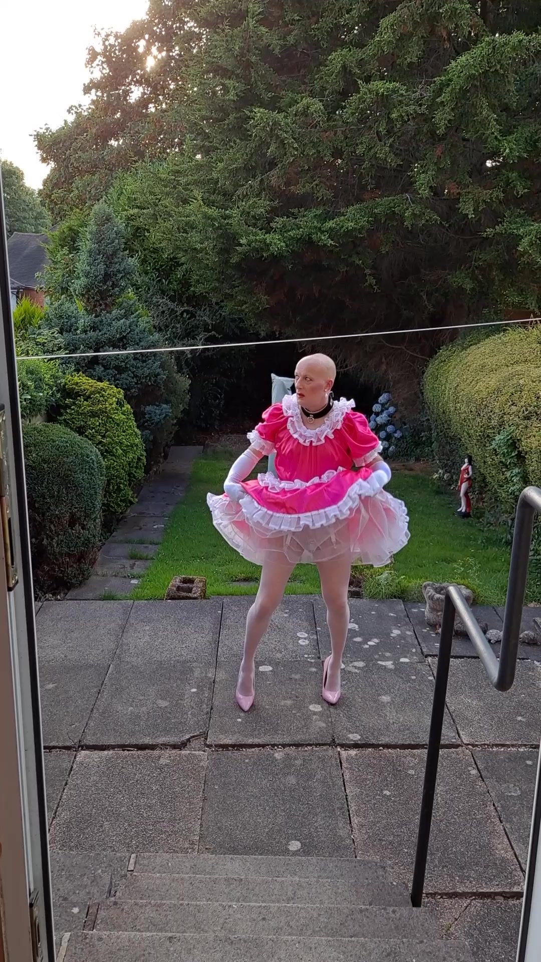 EXPOSING MYSELF WEARING A PINK SISSY MAIDS DRESS, STOCKINGS AND HEELS IN MY BACK GARDEN.