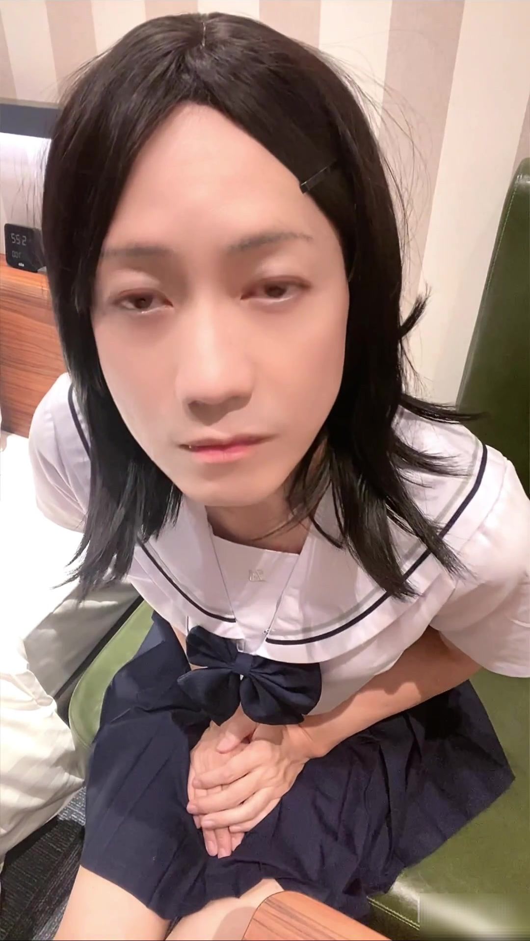 Japanese crossdresser in uniform stretches gams and faps