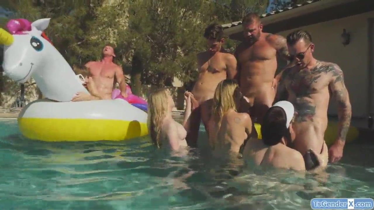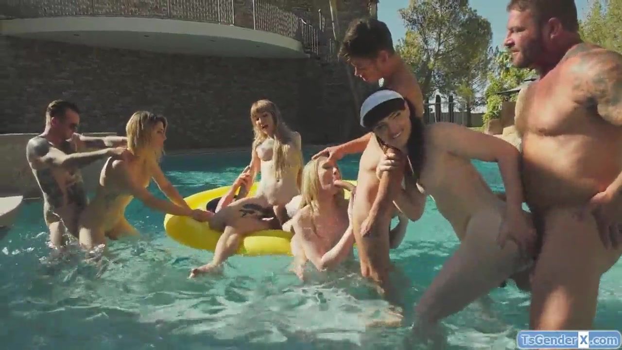 four warm tgirls boinked by pool side in trans pool soiree (Aubrey Kate, Khloe Kay...