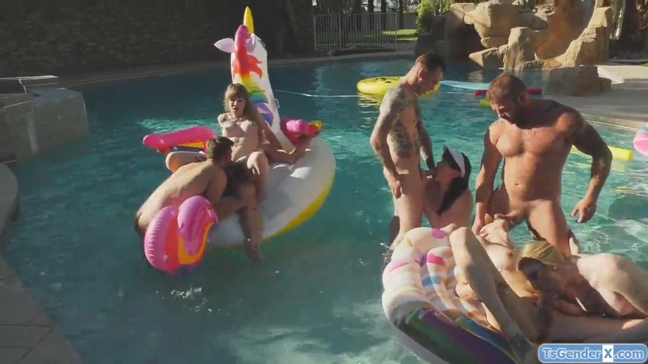 T-Girls Pool Soiree Turns Into a Crazy Fuck-Fest With two Fellows and a Torrid Female