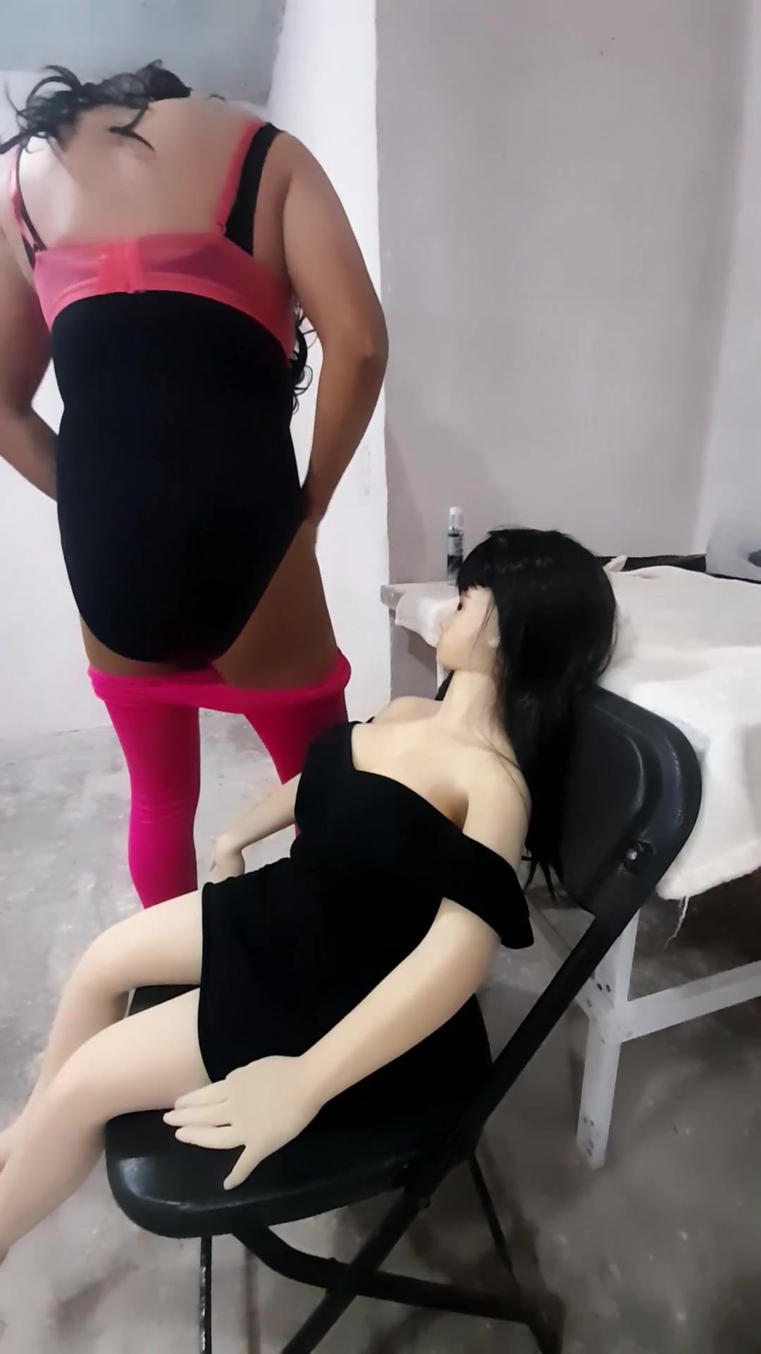Transexual en leggins rosas se divierte con mi muñeca sexual
