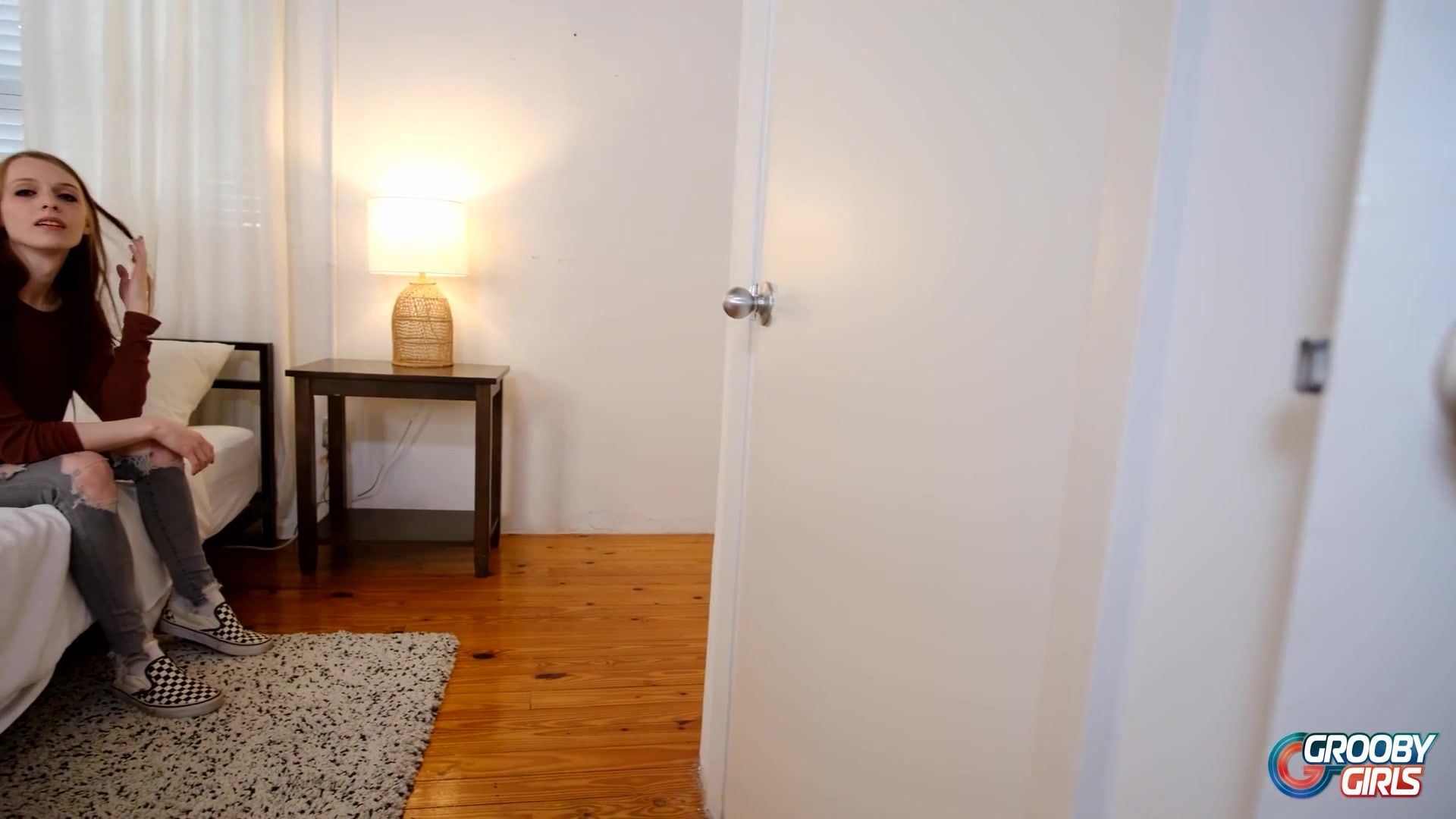 GROOBYGIRLS - Fresh thin Tgirl with freckles on her face masturbates off her stiff...