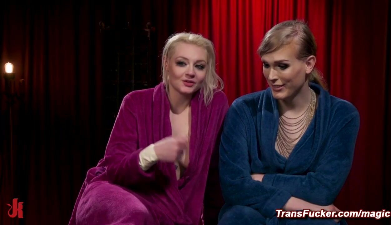 Blonde maid Arielle Aquinas is latex sleeves and black stockings is blindfolded and bound on back then punished by shemale mistress Roxxie Moth later throat and pussy fucked