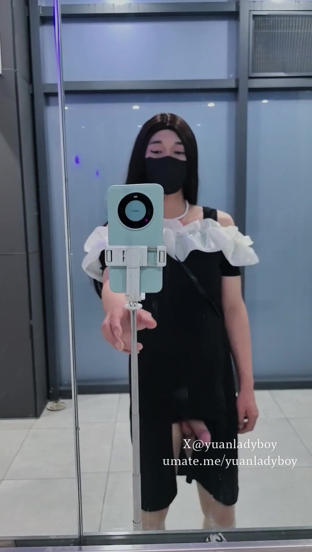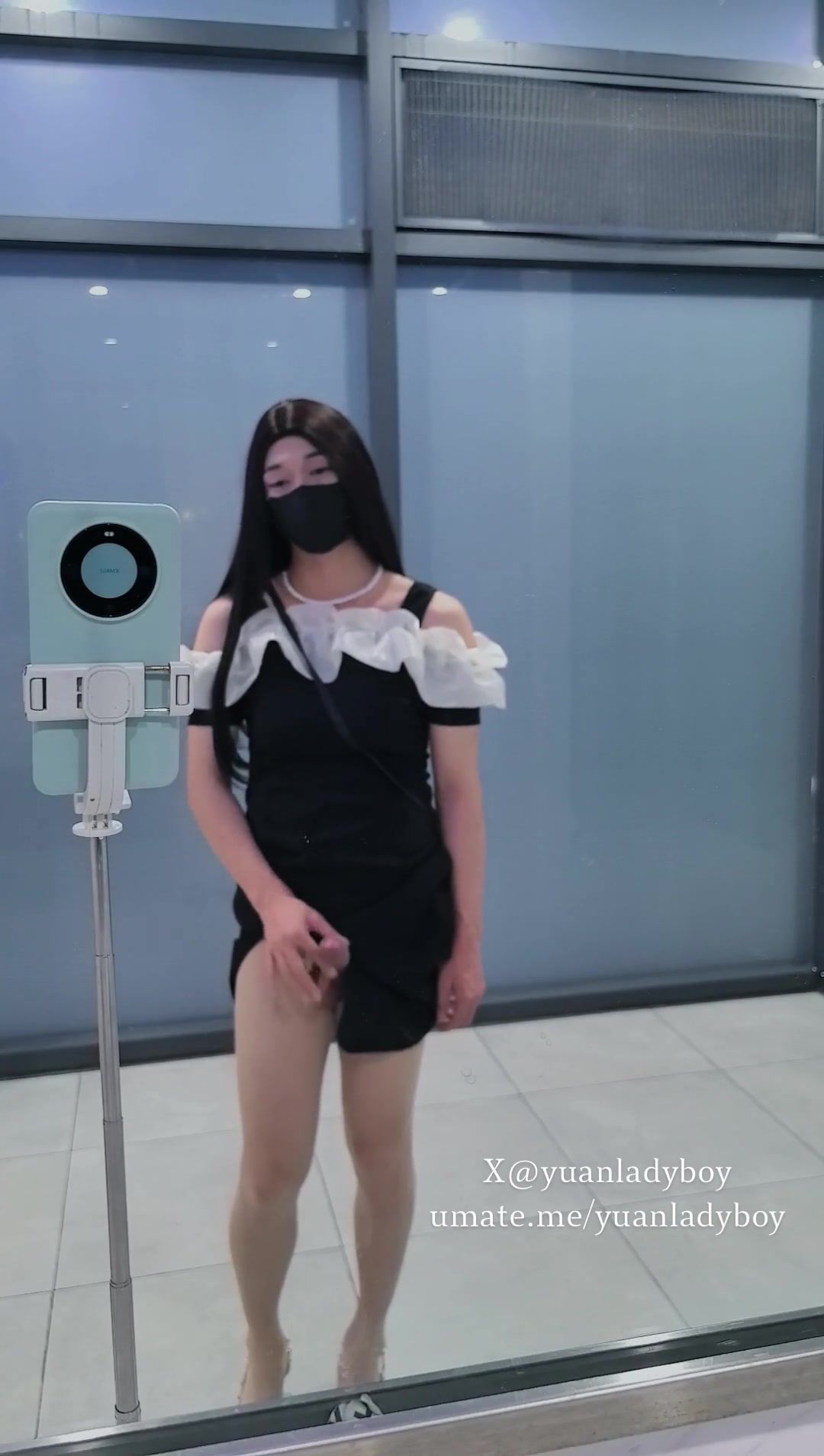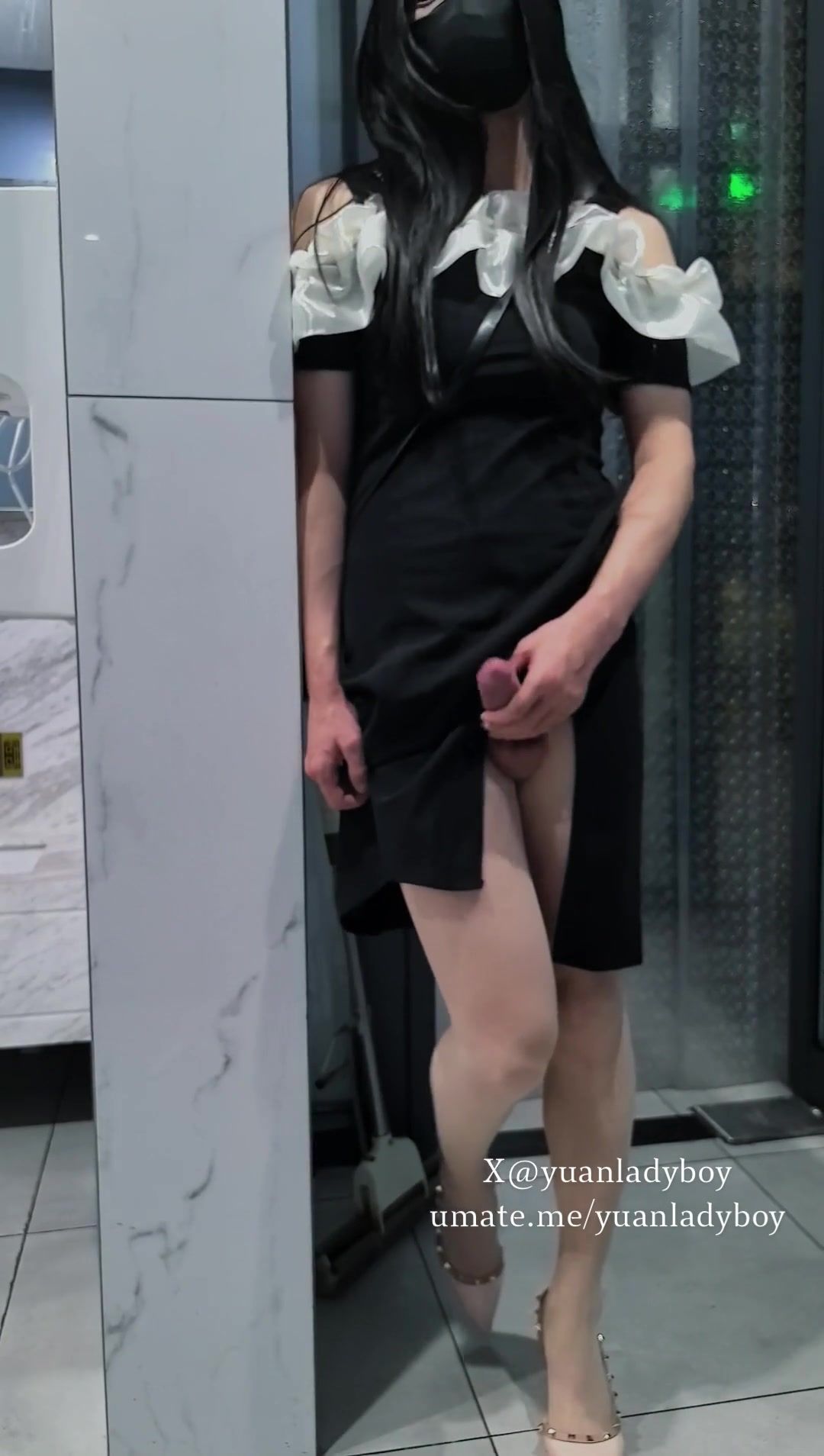 Chinese t-model in black cock-squeezing microskirt finishes off at the door of public rest room