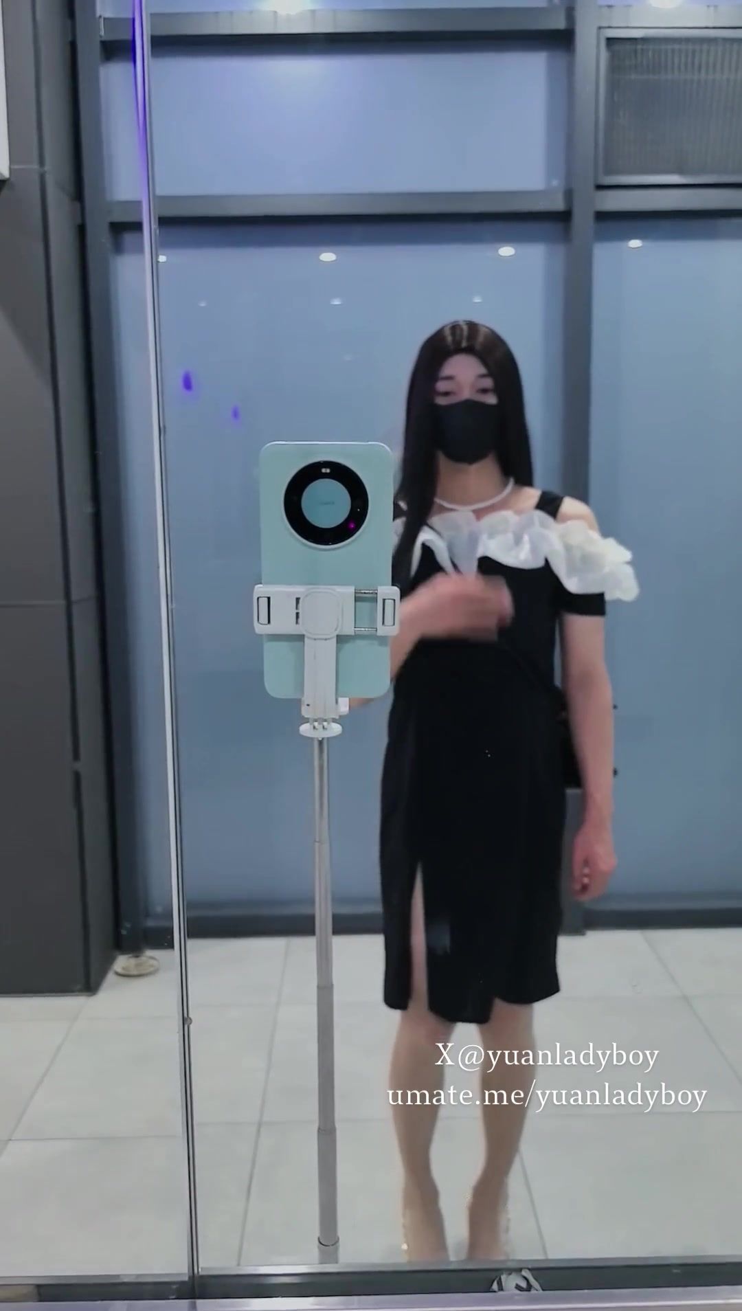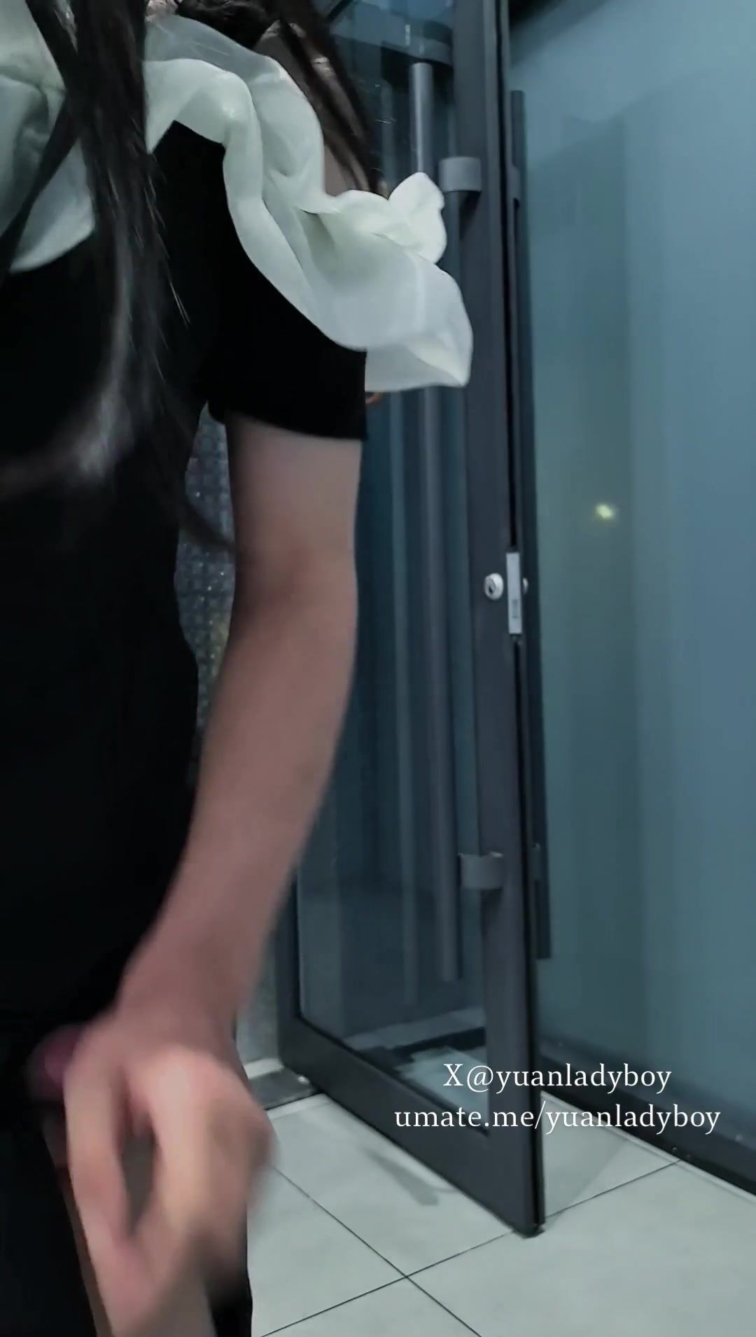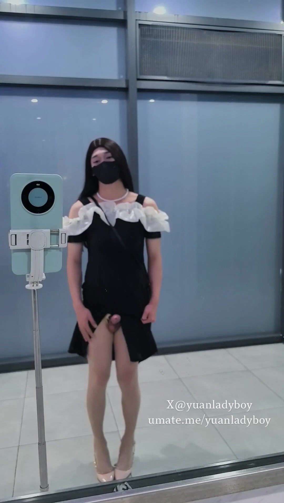 Chinese t-model in black cock-squeezing microskirt finishes off at the door of public rest room