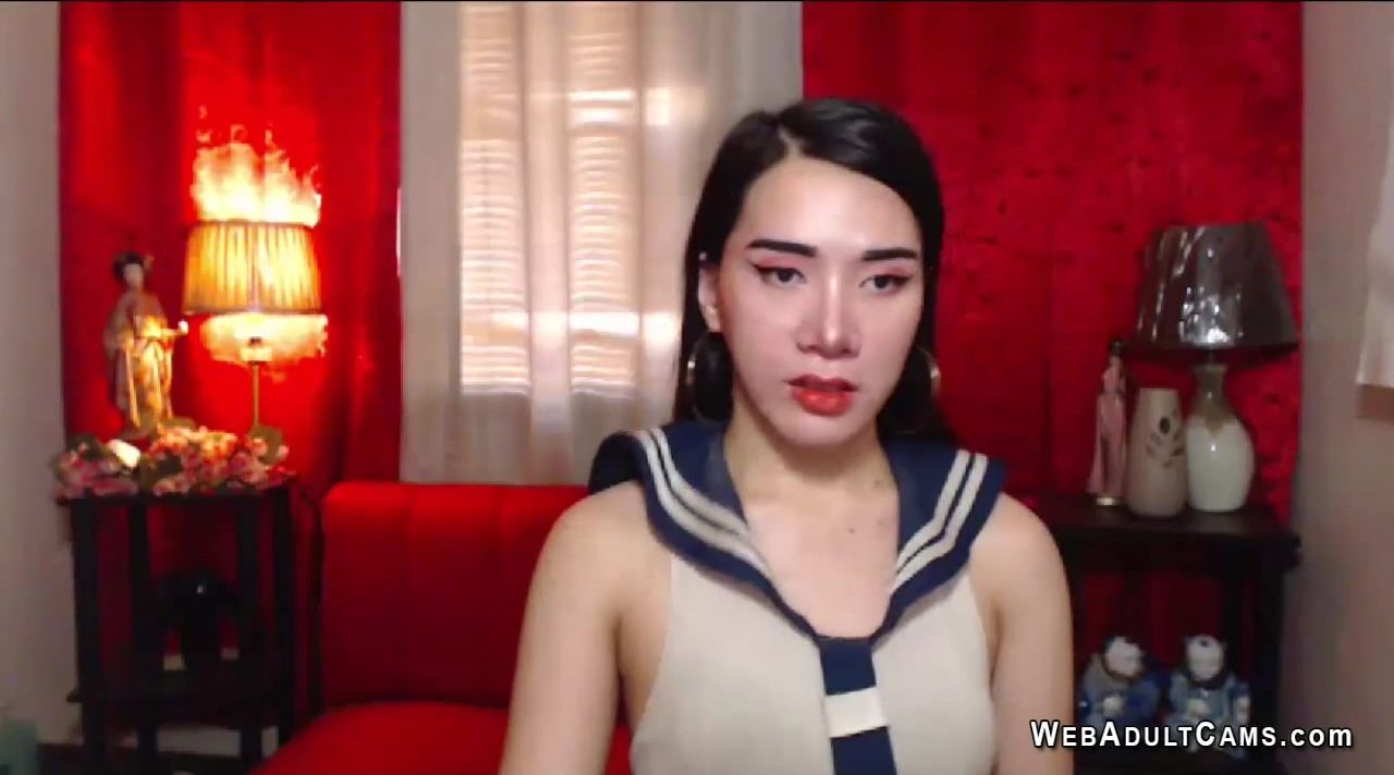 Brunette Asian amateur shemale [censored] BitchSweetHeart in uniform strips and jerks off her dick while chatting on her private homemade webcam show solo