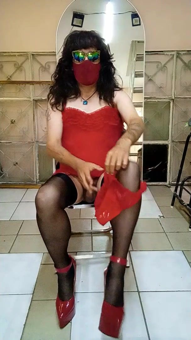 TV escort semen mischievous - crimson harness and crimson 18cm stilettos