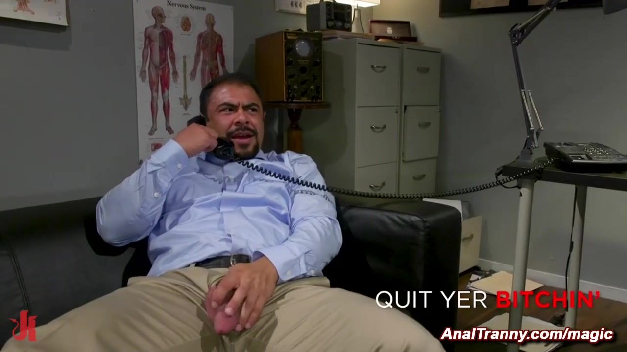 A slender and well endowed shemale mistress Venus Lux in lingerie catches muscle Draven Navarro having phone sex then she diciplines and spanks and anal fucks him