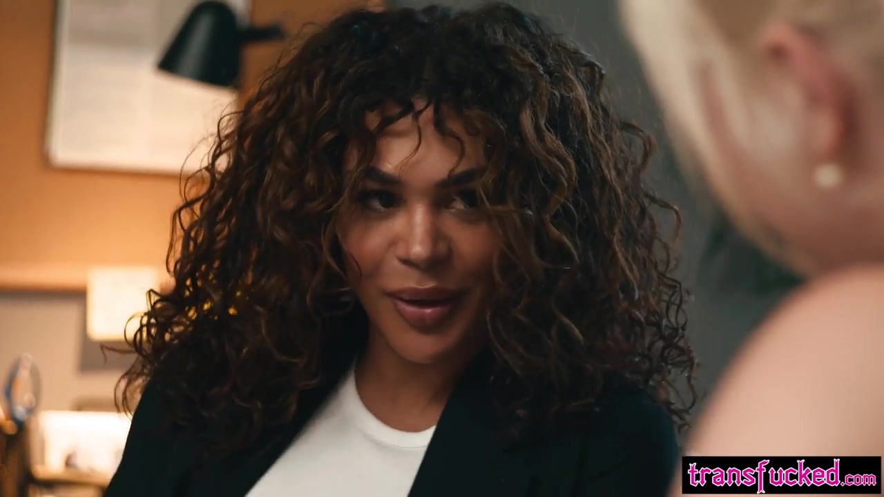 Blonde big tits MILF Skye Blue got fucked by shemale employee with perfect big cock and big ass Eva Maxim Tranny enjoyed kissing with hot blonde MILF After kissing and perfect blowjob shemale banged horny blonde MILF with big tits