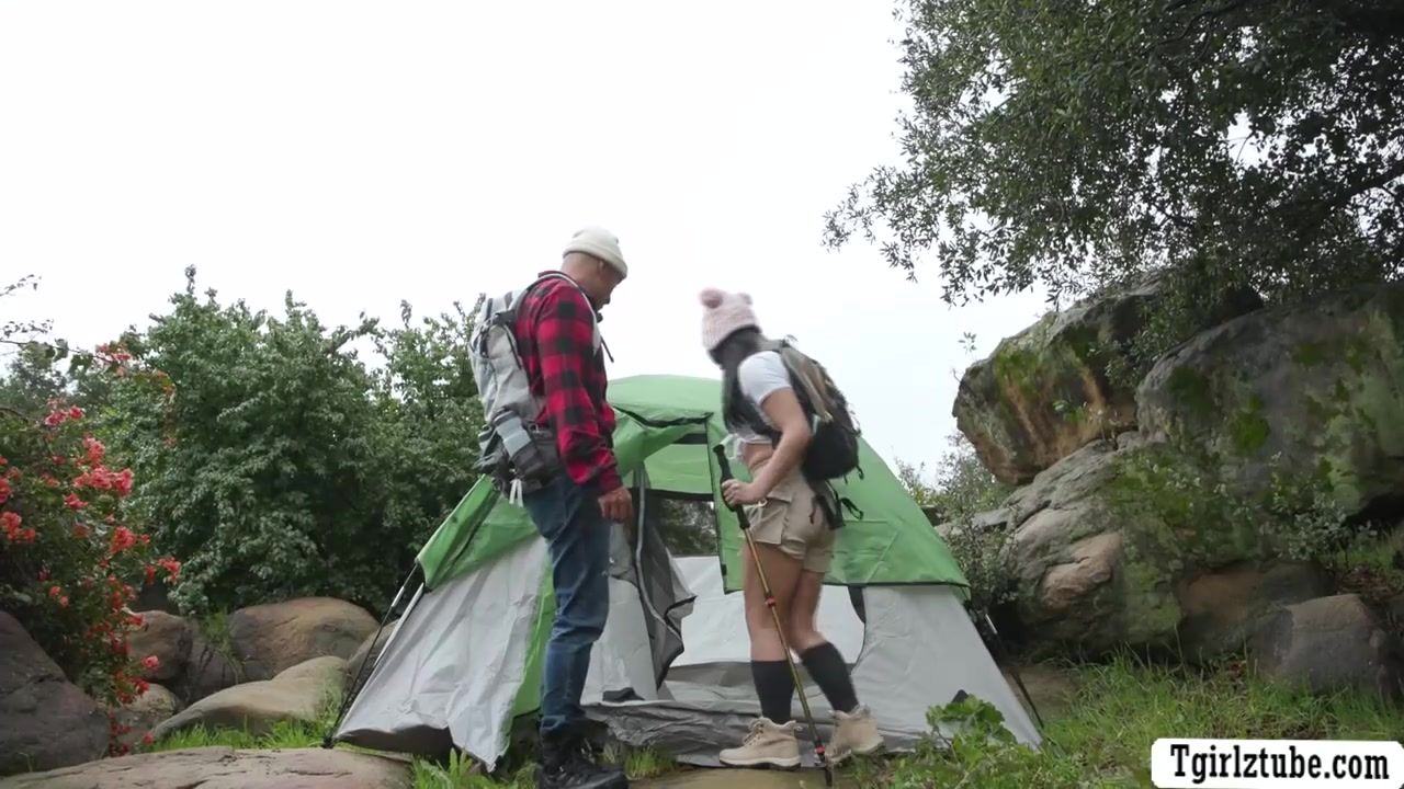 Beautiful shemale hiker Ember Fiera and her black friend King Noire are camping in the woods.They set up their tent and she then throats Kings big dick passionately.In return,King bareback fucks her ass so deep and go to Tgirlztube.com for discount.