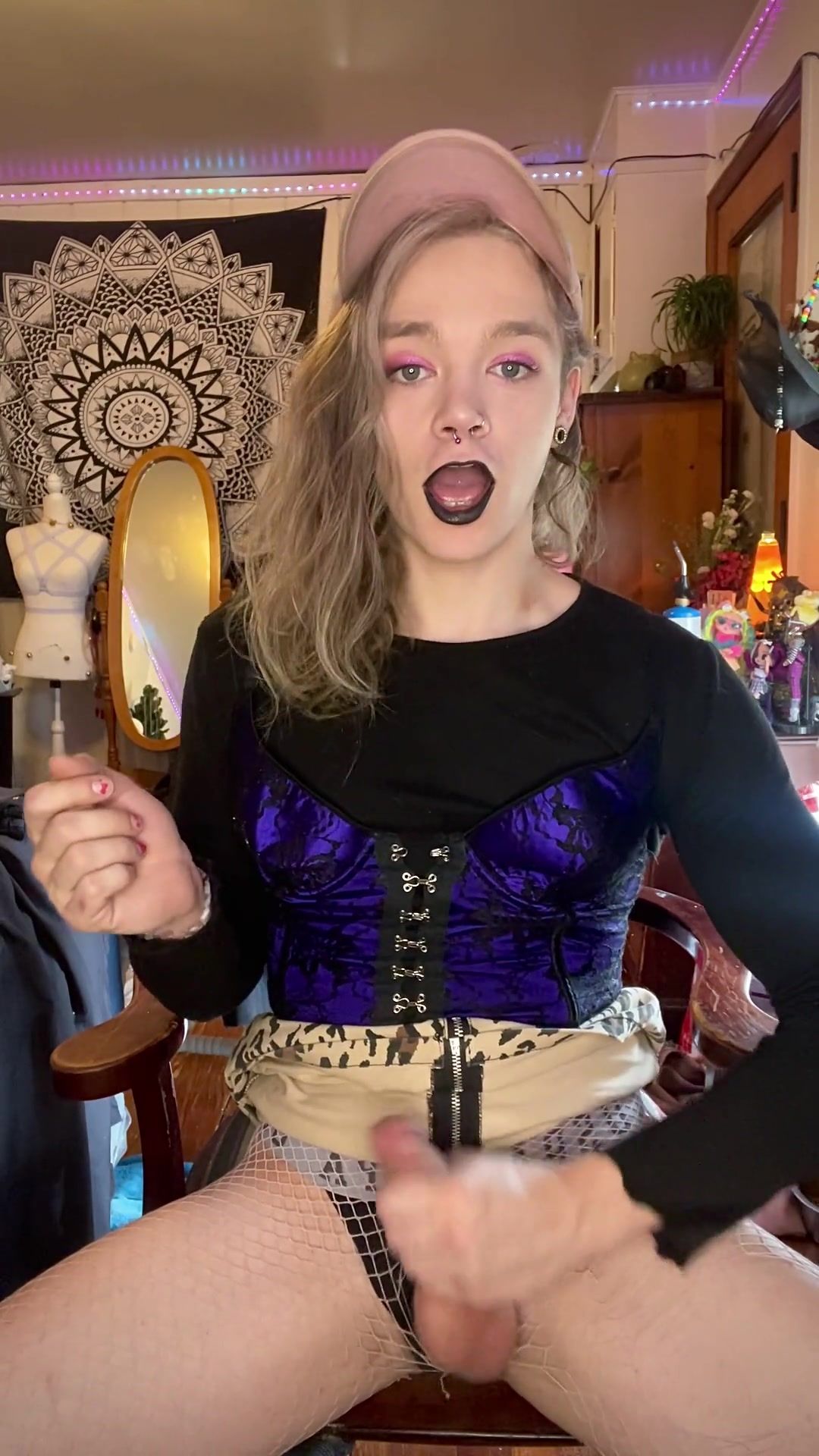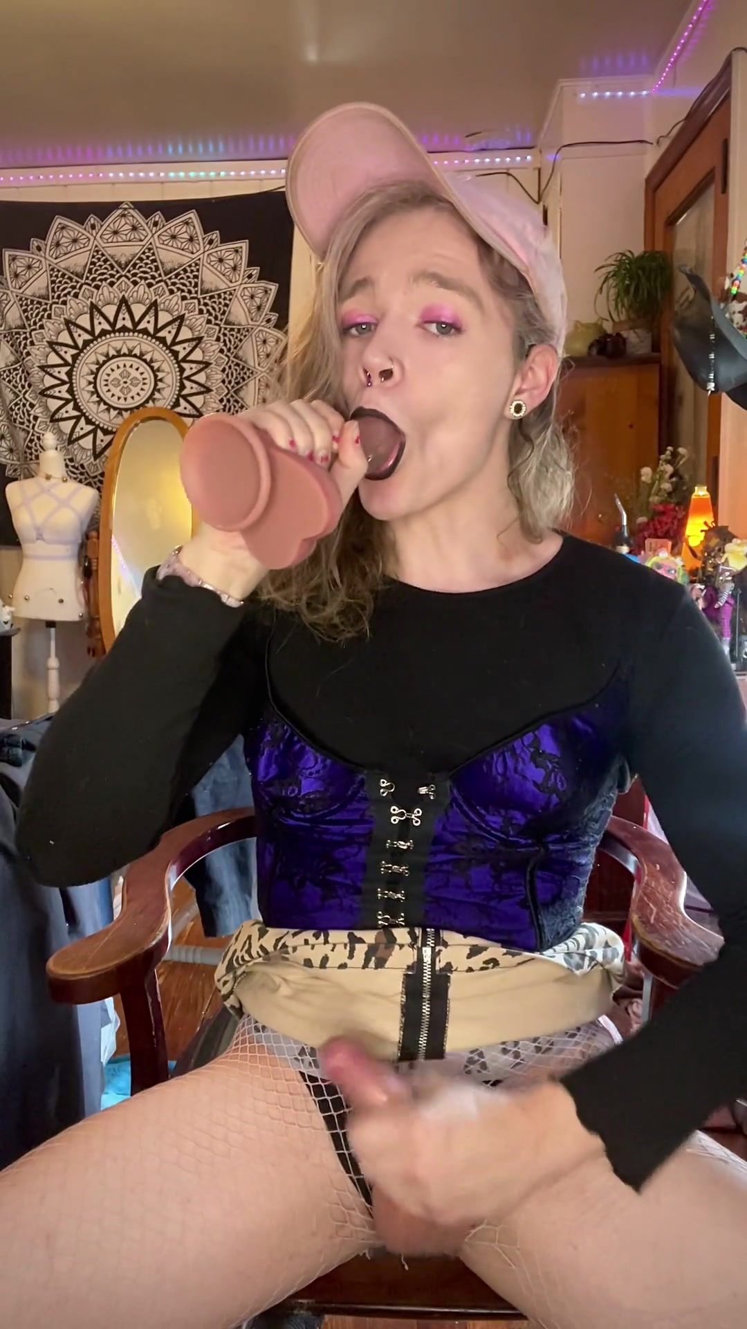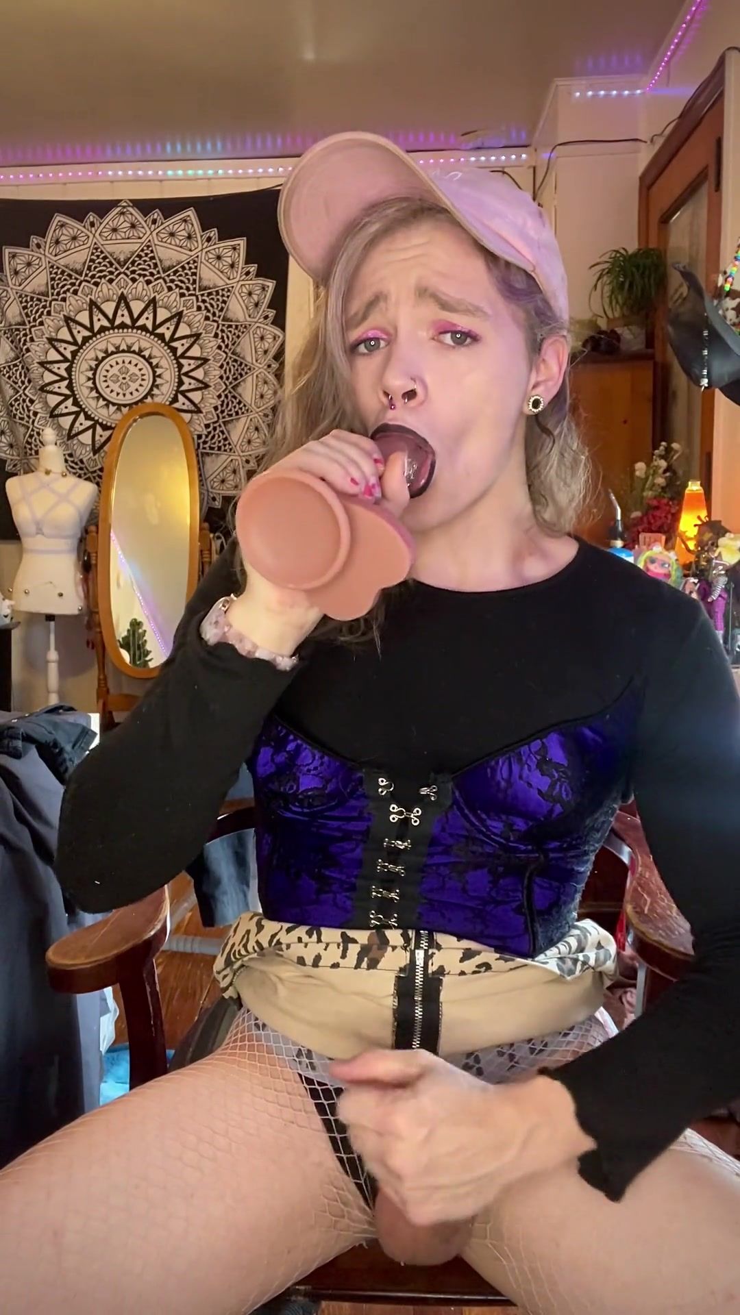 Alt Trans Fem in Black Lip liner Drains Off, Fellates a Realistic Faux-cock and Licks Jizm Off it