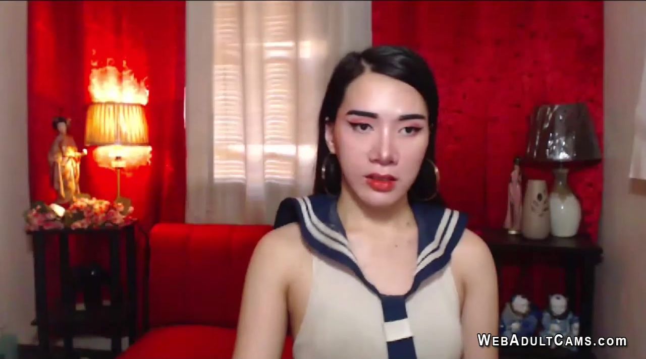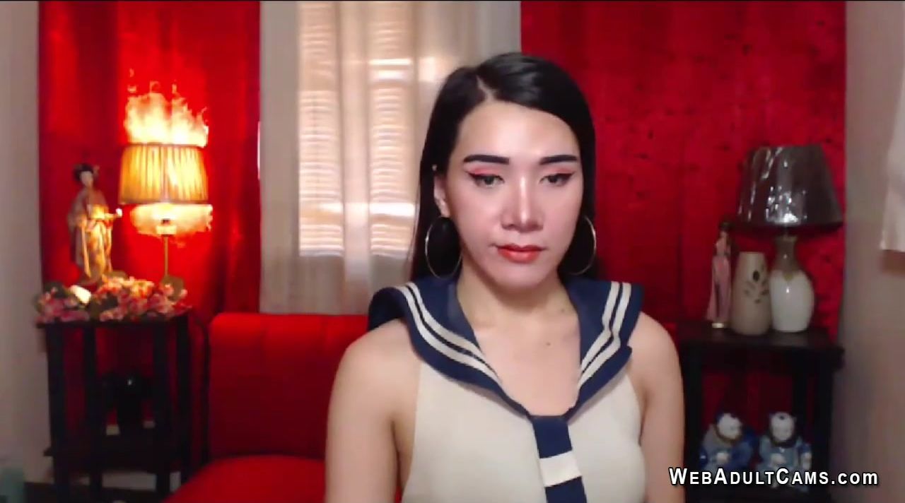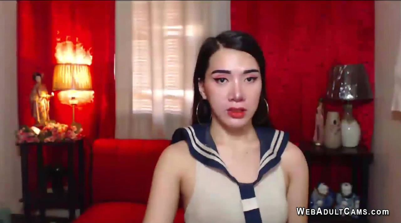 Brunette Asian amateur shemale schoolgirl BitchSweetHeart in uniform strips and jerks off her dick while chatting on her private homemade webcam show solo