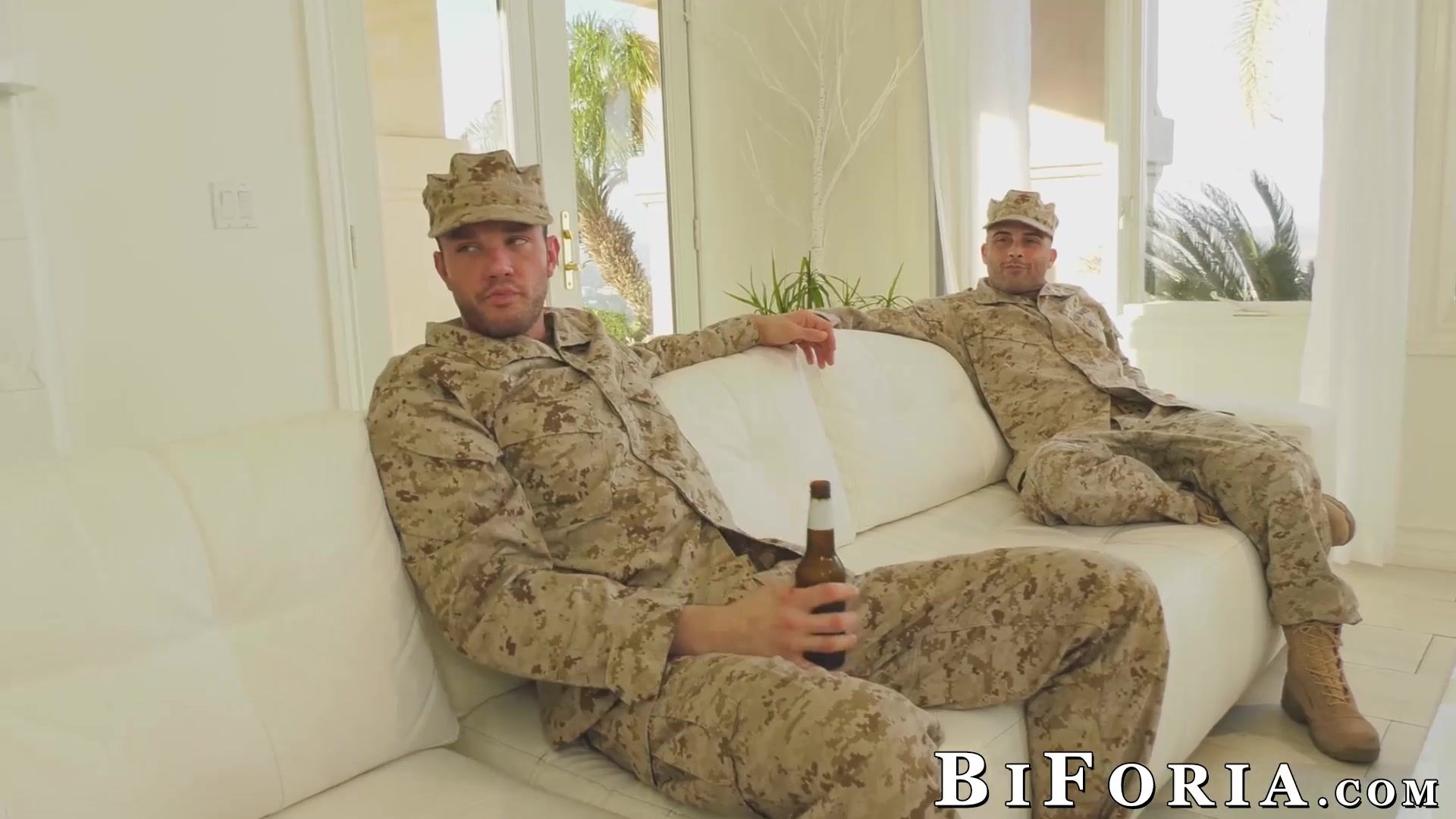 MILF seduces bisexual army jocks with wet foreplay before they bang each other in fetish threesome.