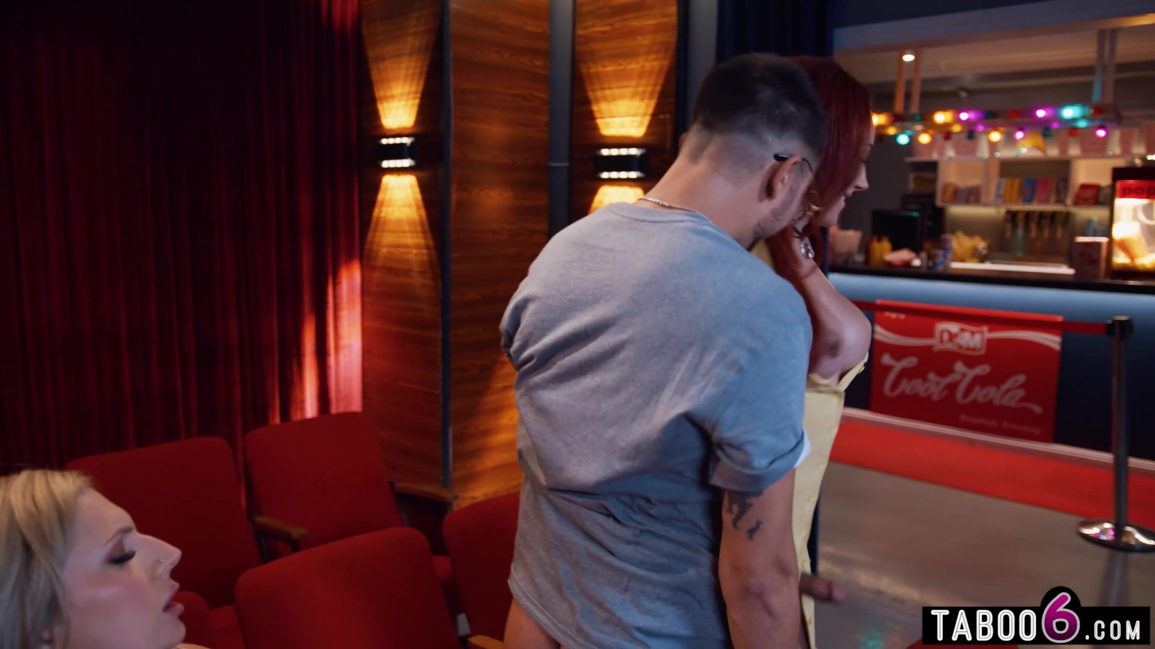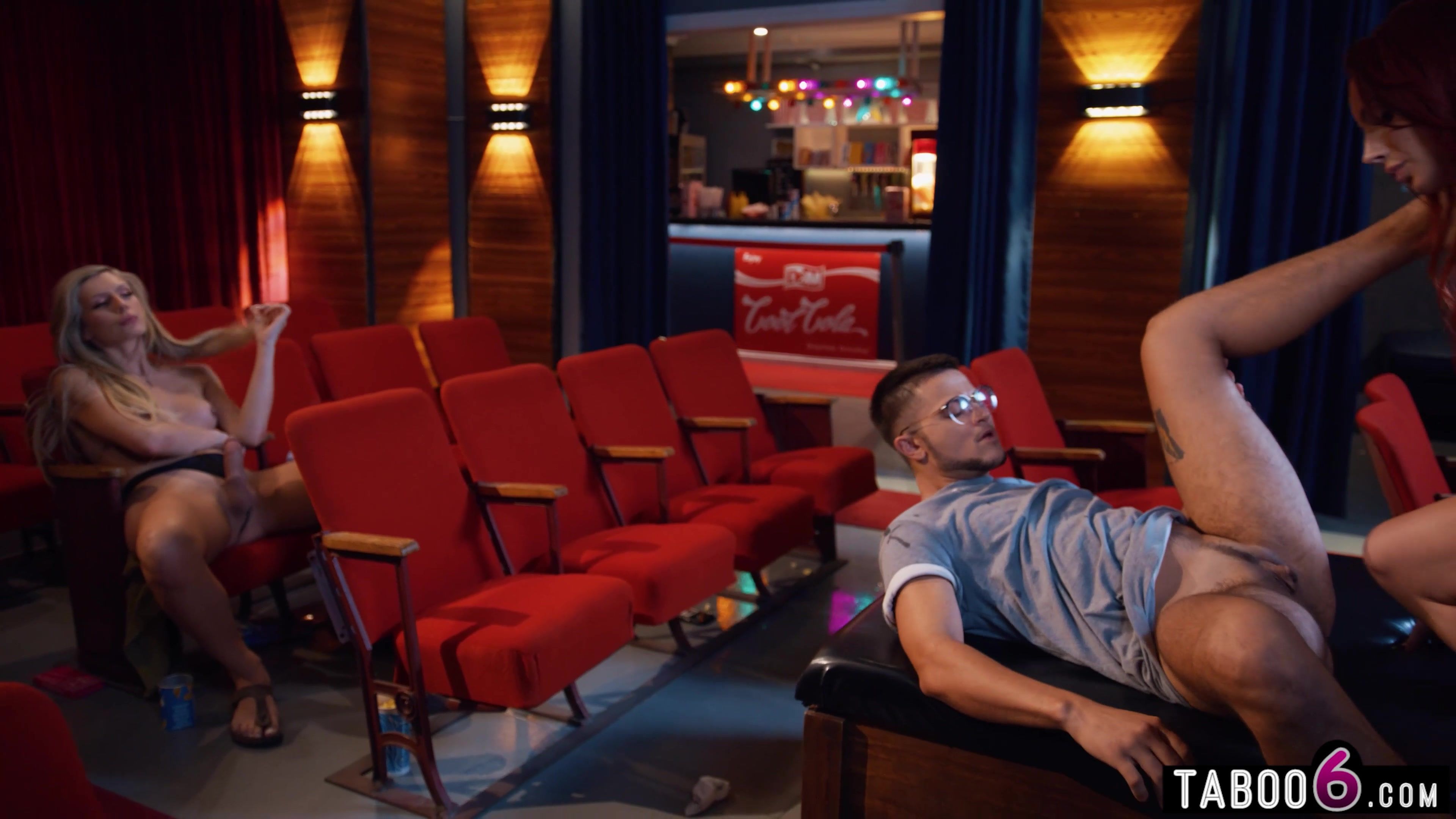 SHOCKING Guy with a pussy gets tag teamed by two hot curvy trannies with big cock in a movie theather! First they sucked each other off when he went for snacks but then he wanted to sit inbetweem them and then this happened!
