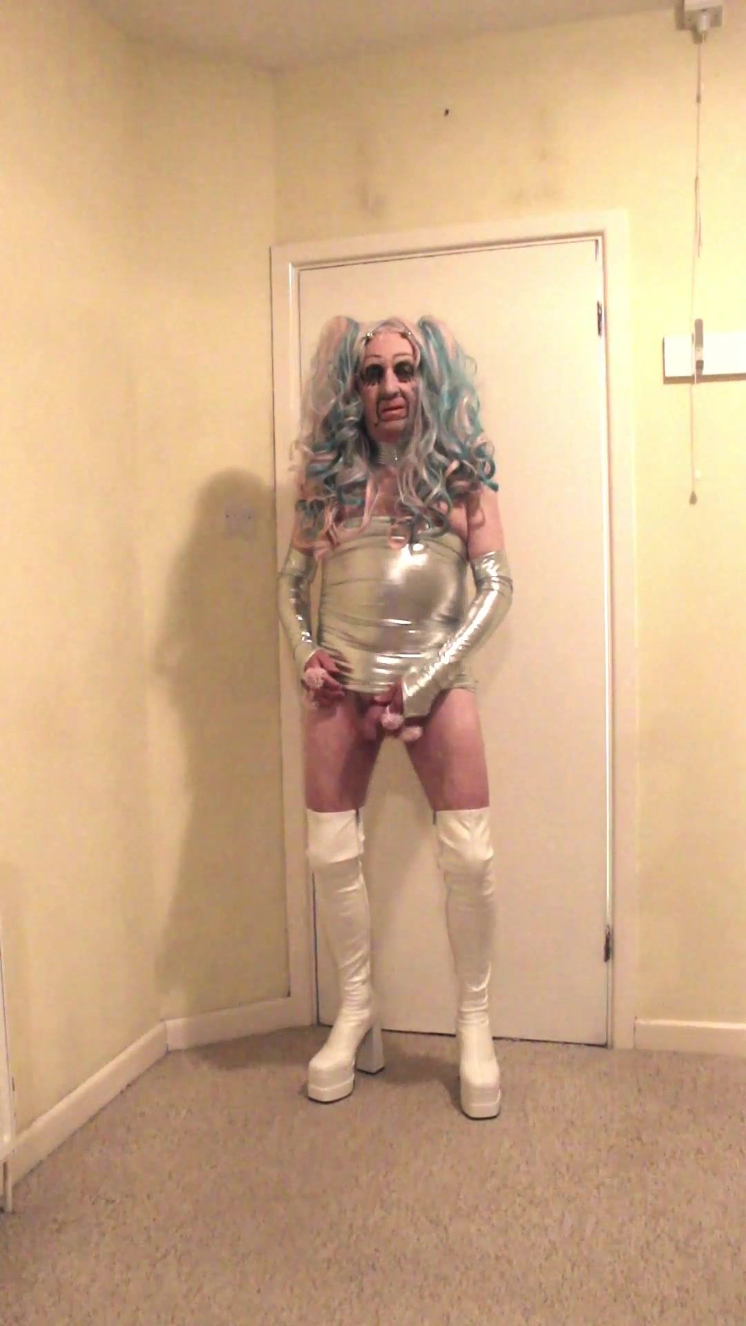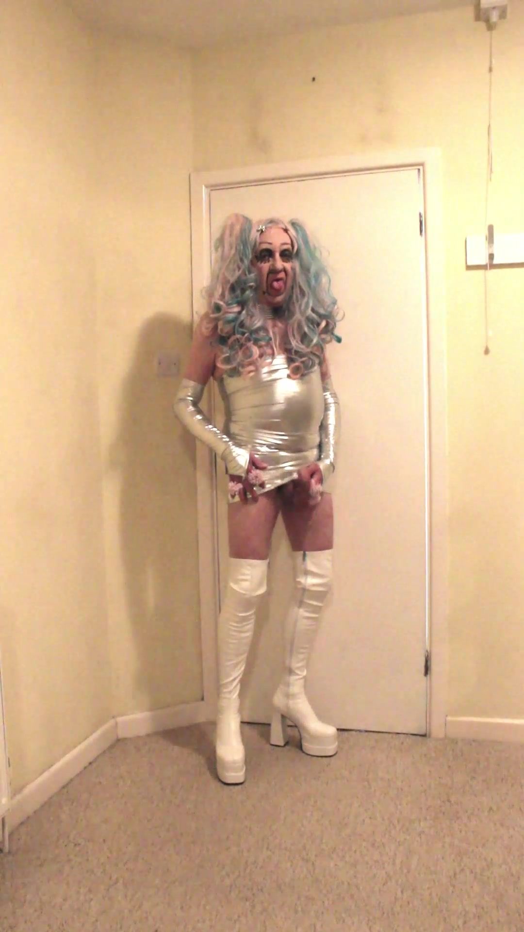 Pink and blue haired tranny slut in white thigh boots