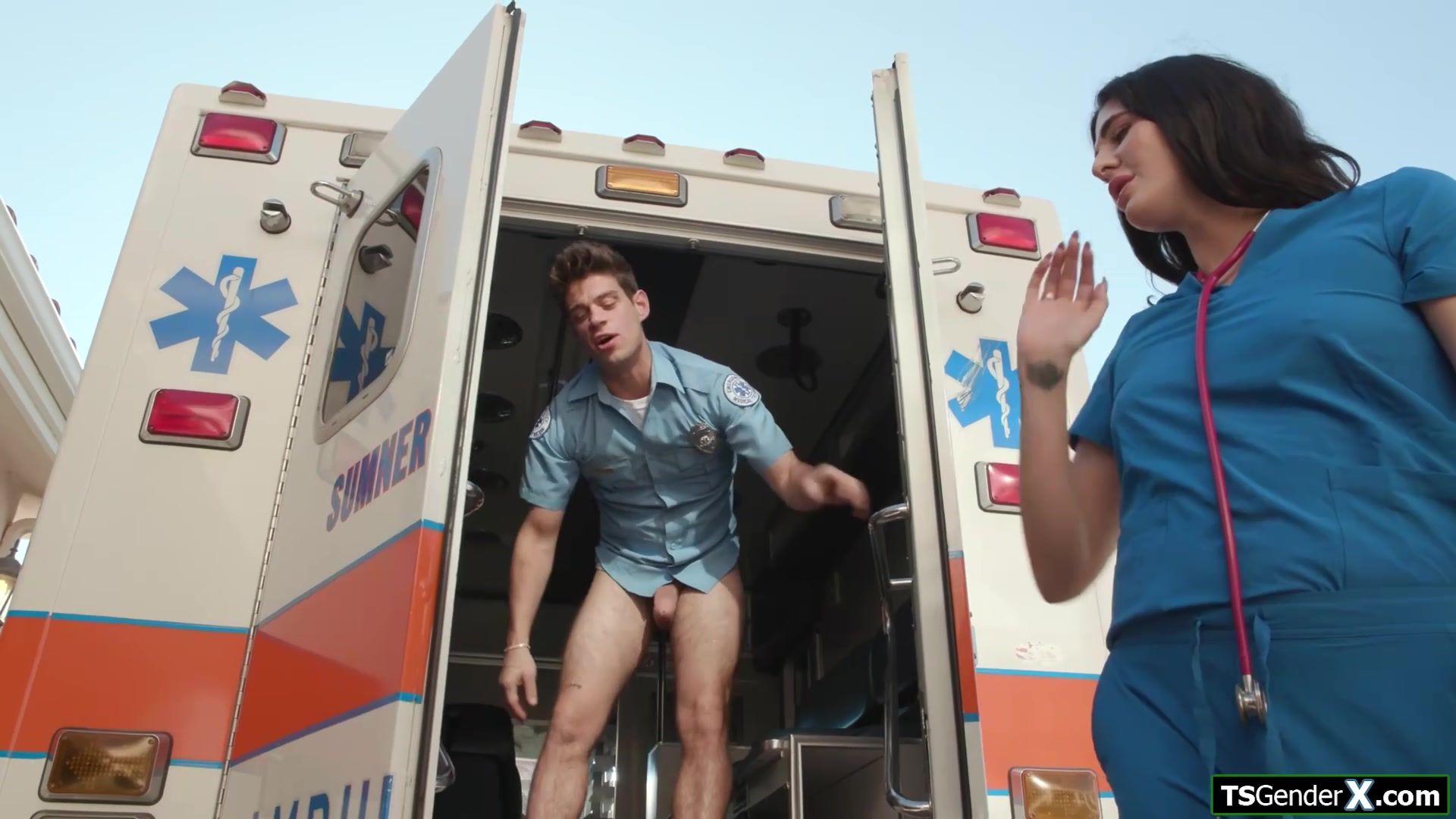 Trans nurse Bailey Archer catches her colleague jerking off in the back of an ambulance and is invited to join.The big cock tgirl deepthroats his dick and gives a double handjob.The brunette shemale bends over to get rimmed and is anal barebacked