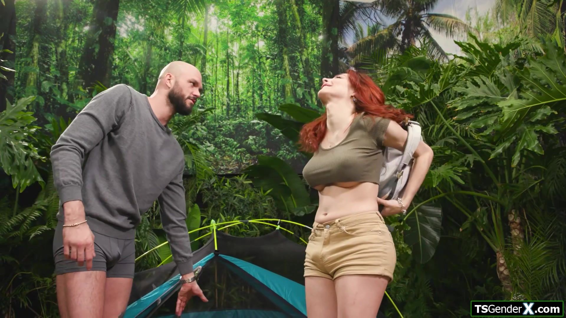 Trans Ariel Demure stumbles on a camper after been lost for hours.He takes out his massive cock and the busty shemale sucks it off.He tittyfucks the redhead tgirl and deepthroats her tranny dick.The transsexual is rimmed and bareback anal reamed