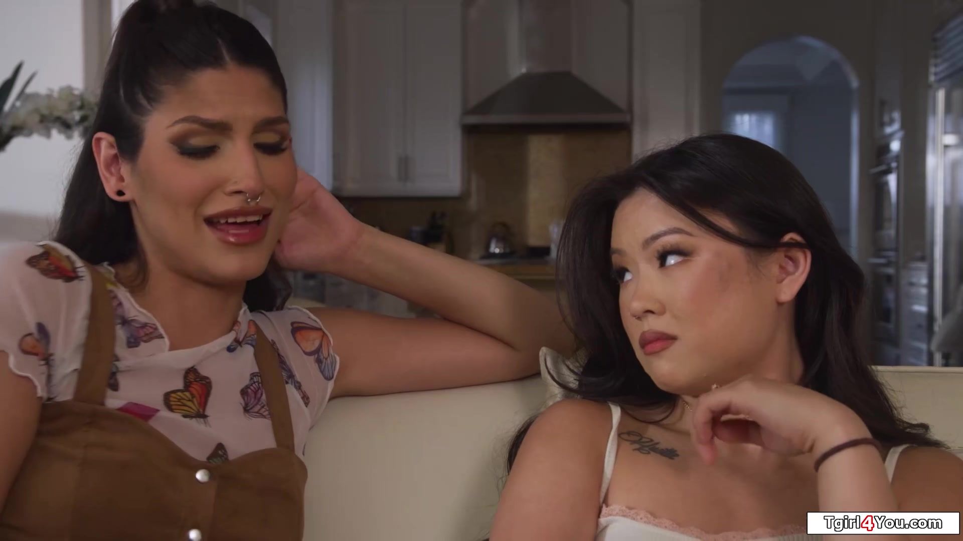 Asian Lulu Chu dares shemale gf Zariah Aura to creampie her.The latin tgirl jerks her big tranny cock while licking pussy.The small tits oriental babe deepthroats her trans dick.The brunette transsexual stuffs her boner up her girfirends snatch