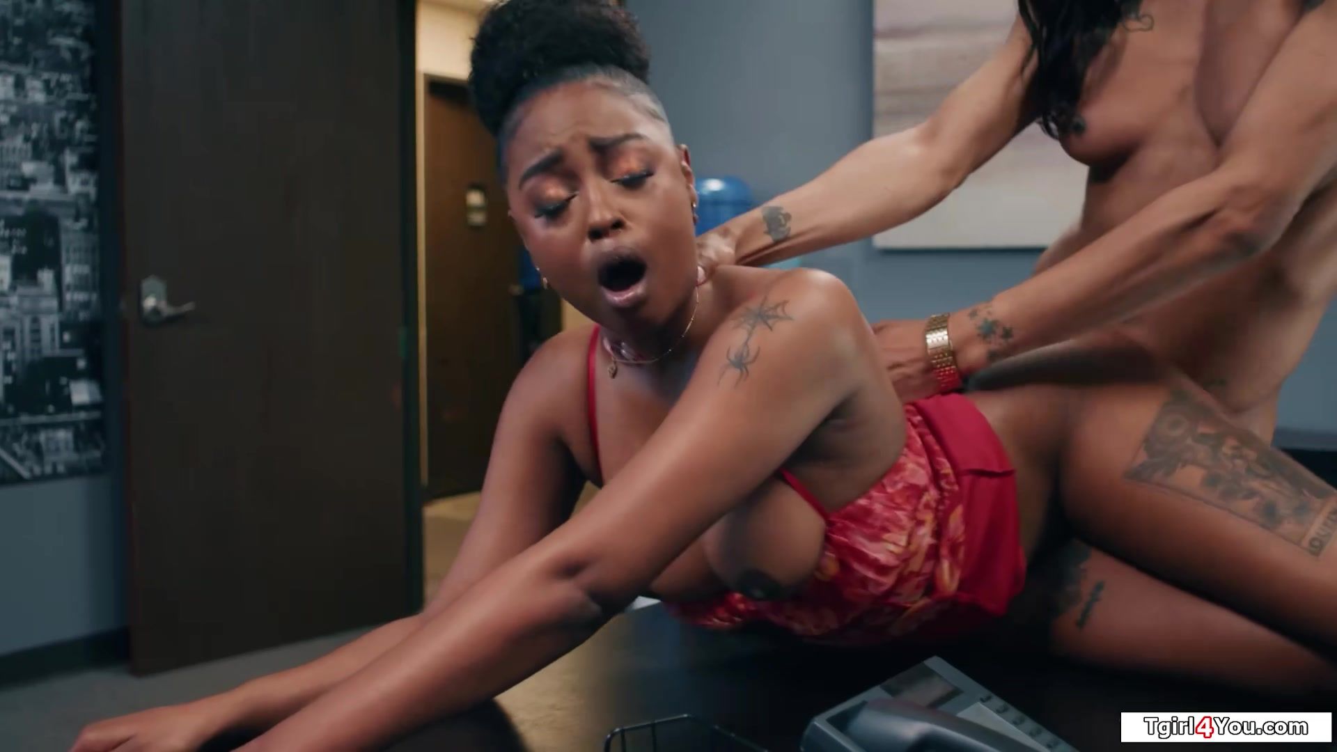 Busty ebony tgirl Leilani Li puts her tranny dick in her black boss Destiny Miras pussy.The shemale secretary gets deepthroated and is rimmed.The brunette tattooed trans eats the babes snatch on her desk so it wet enough to bang her some more