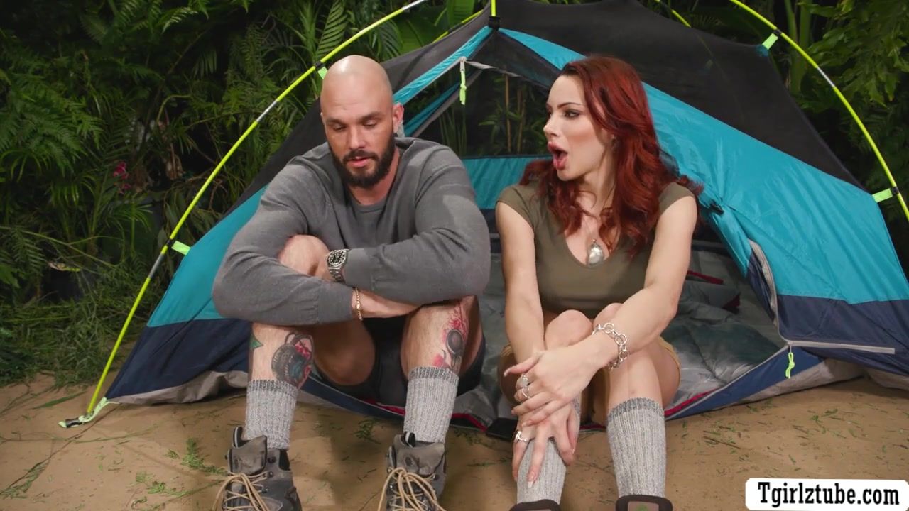 Mountain climber Cliff Jensen and TS Ariel Demure set up their camping tent and start kissing each other.After that,Ariel throats Cliffs hard dick and rides it after.Go to Tgirlztube.com for more videos like this to watch.
