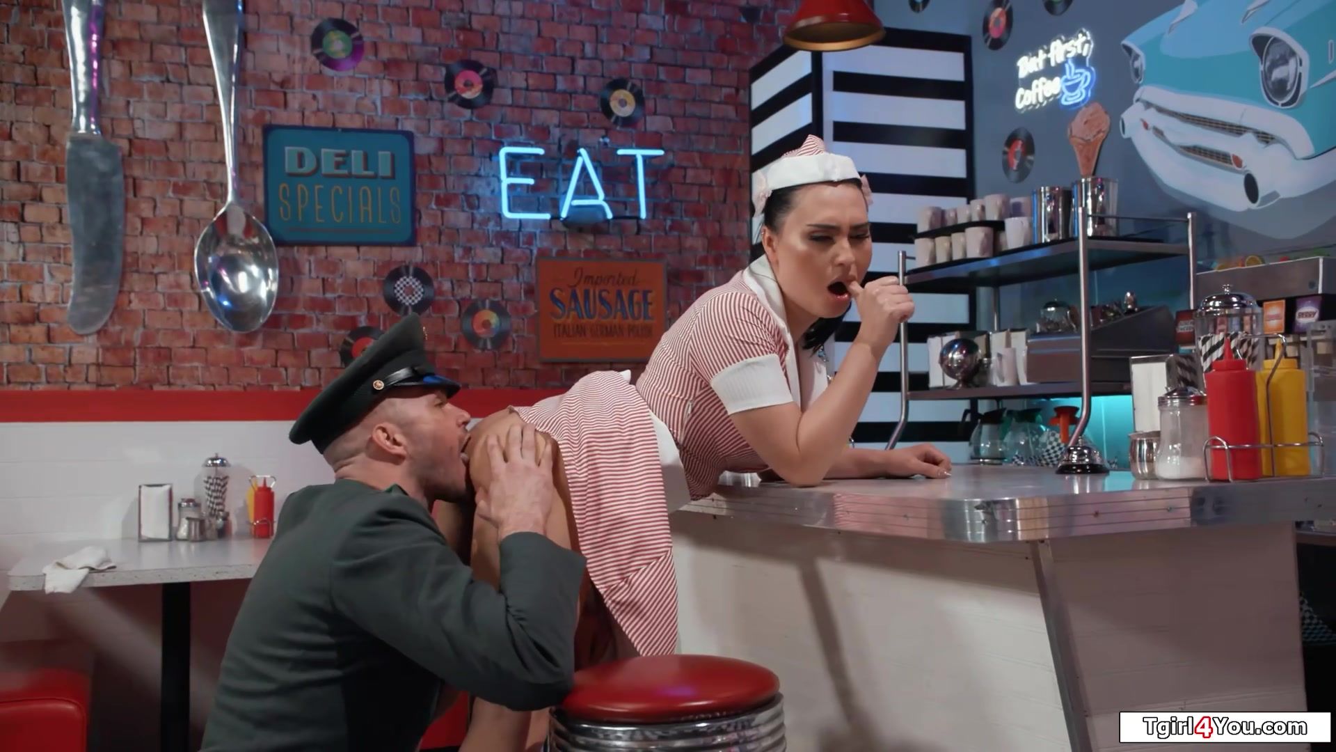 Asian shemale waitress Ember Fiera cleaning when her husband shows up.He rims the big tits tgirl in her diner and sucks her small tranny dick.The oriental trans deepthroats his cock and after a double handjob the busty transsexual is anal barebacked