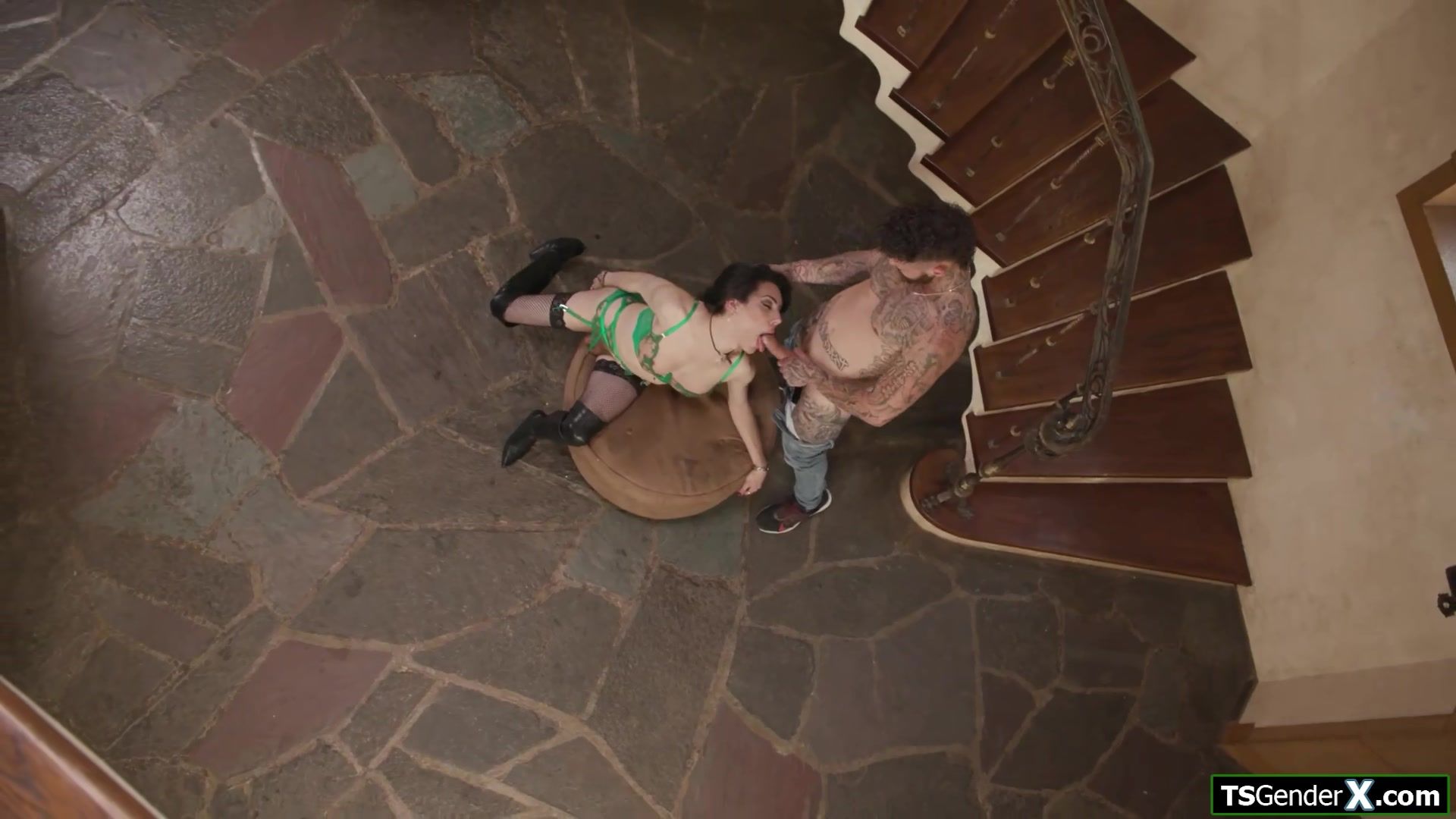 Latina tgirl Ariel Demure awaits on cock with her mouth open.The busty shemale gags on a big dick and is rimmed.The big tits tranny is facefucked in a 69er and is put against the stairs to get her tight ass anal barebacked while she jerks off