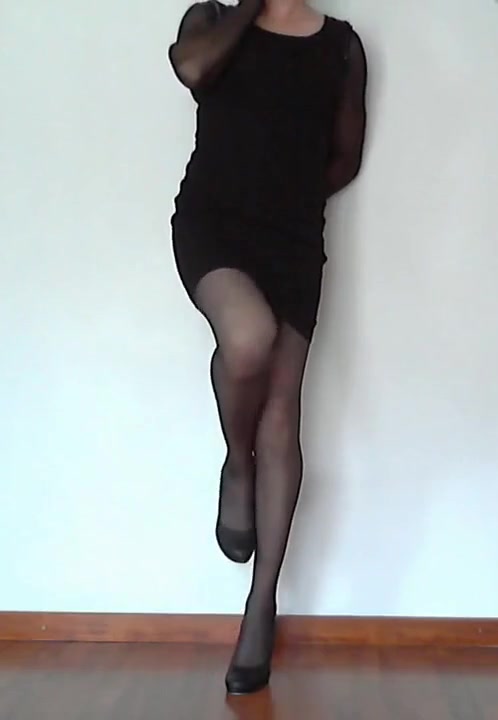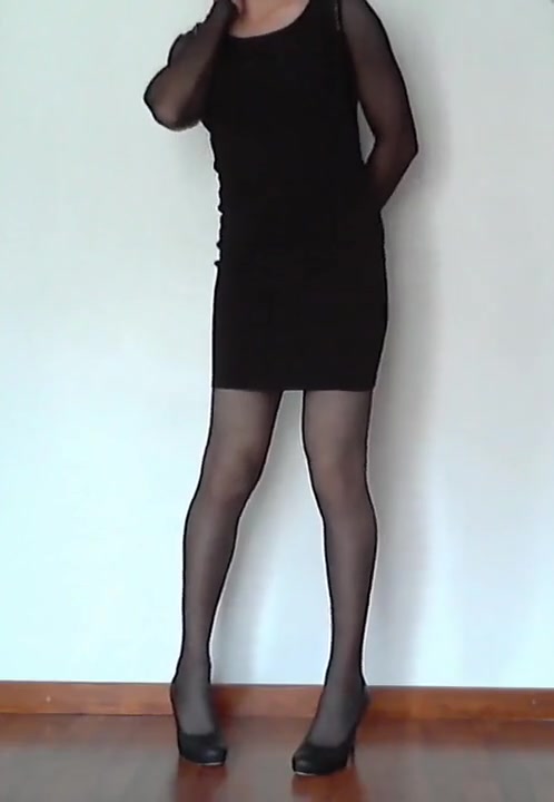 CD posing in pantyhose and black sundress, spunking on sundress
