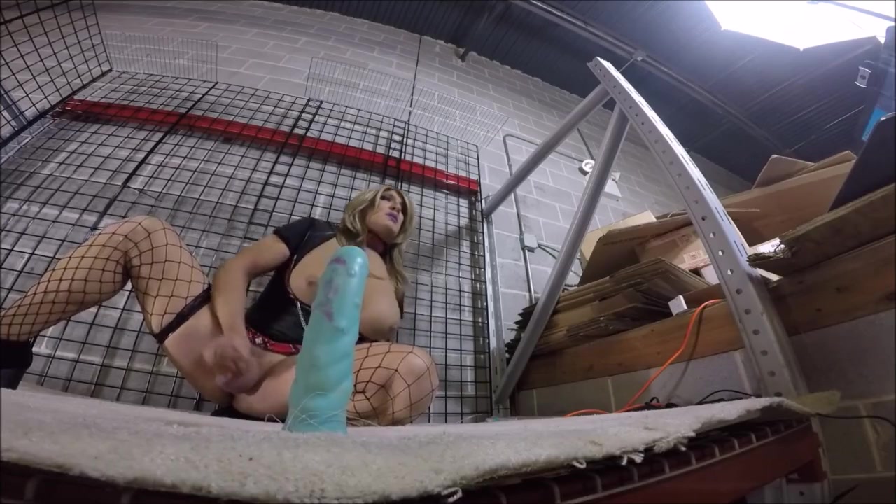 Fucking a huge dildo 30 feet up on a warehouse rack