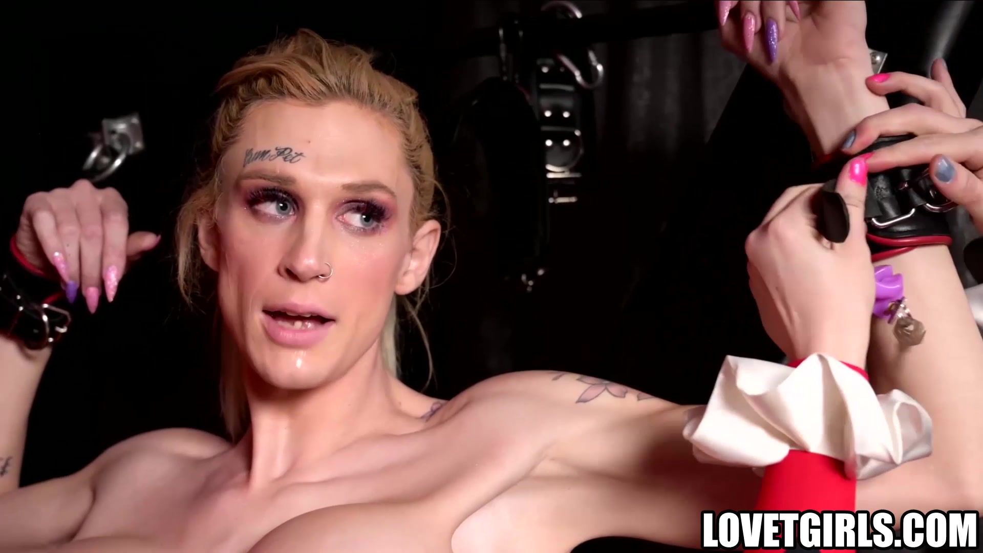Naughty babe Leya Falcon dominates submissive busty trans Aphrodite Adams who craves to have her mouth penetrated with a big strap-on before hardcore anal.