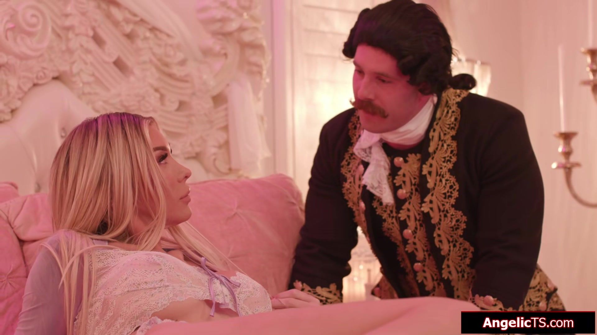 Big tits shemale princess Aubrey Kate is horny and wants her courtiers to fuck her.The busty tgirl sucks their big cocks.The blonde trans is anal barebacked while she gives a blowjob.A guy facesits the tranny so he gets rimmed while jerking off