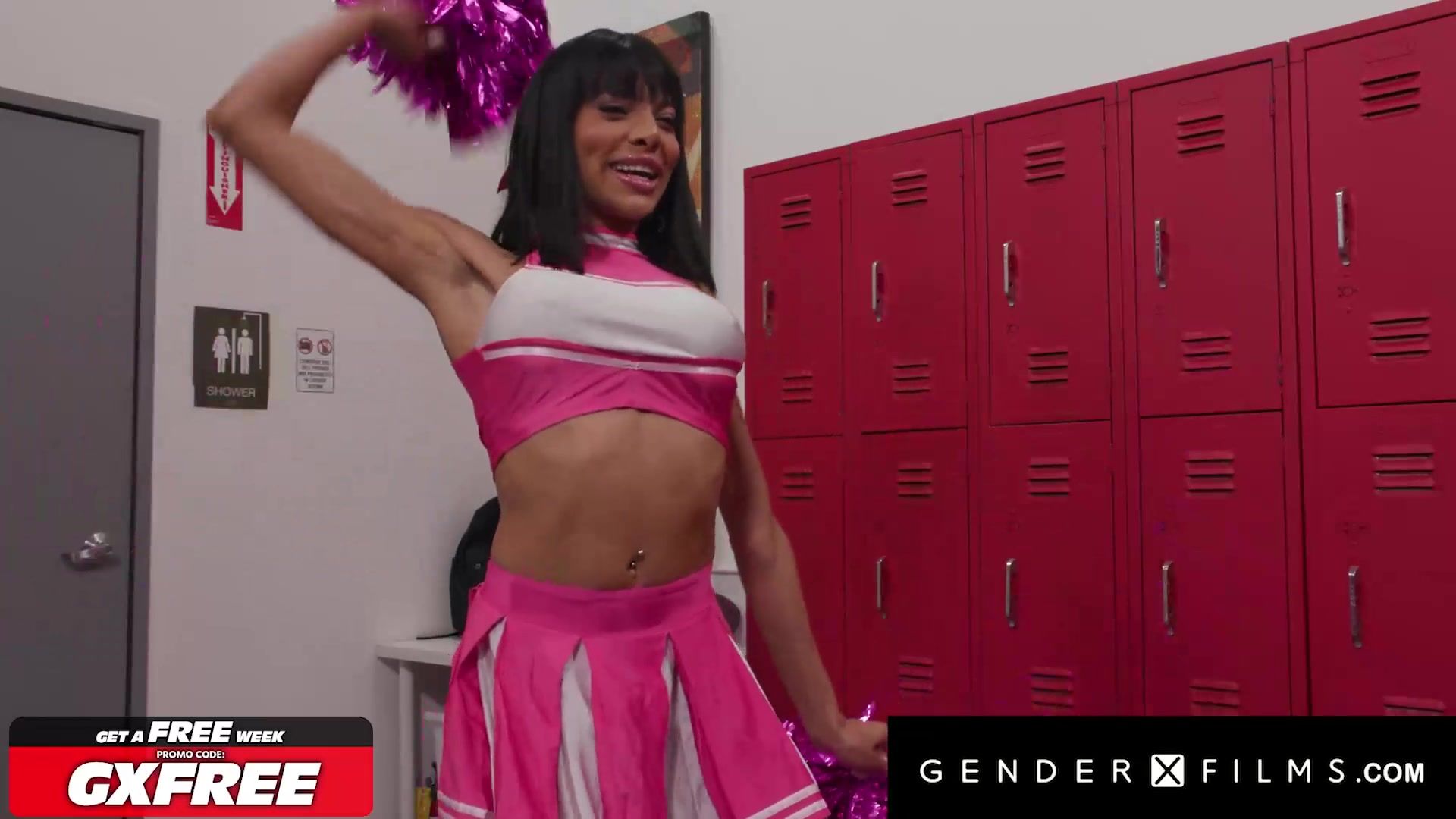 MILF cheerleader gets banged by shemale in locker