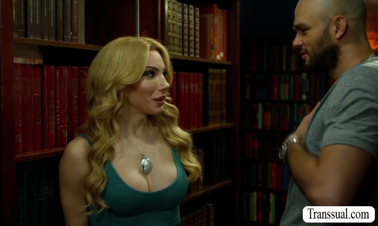 Gorgeous TS librarian Ariel Demure is duty in library and Cliff Jensen arrives and lets her throat his angry dick.After that,he bareback fucks her tight butthole and go to Transsual.com for more like this to watch and more discount.