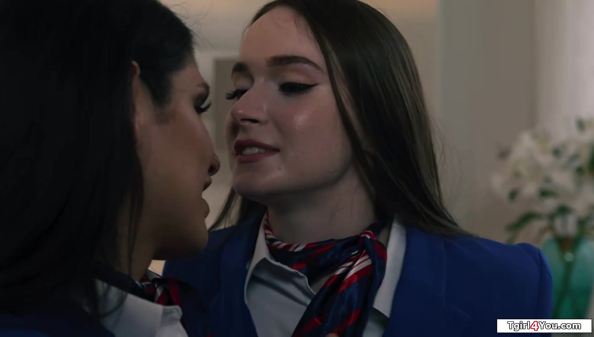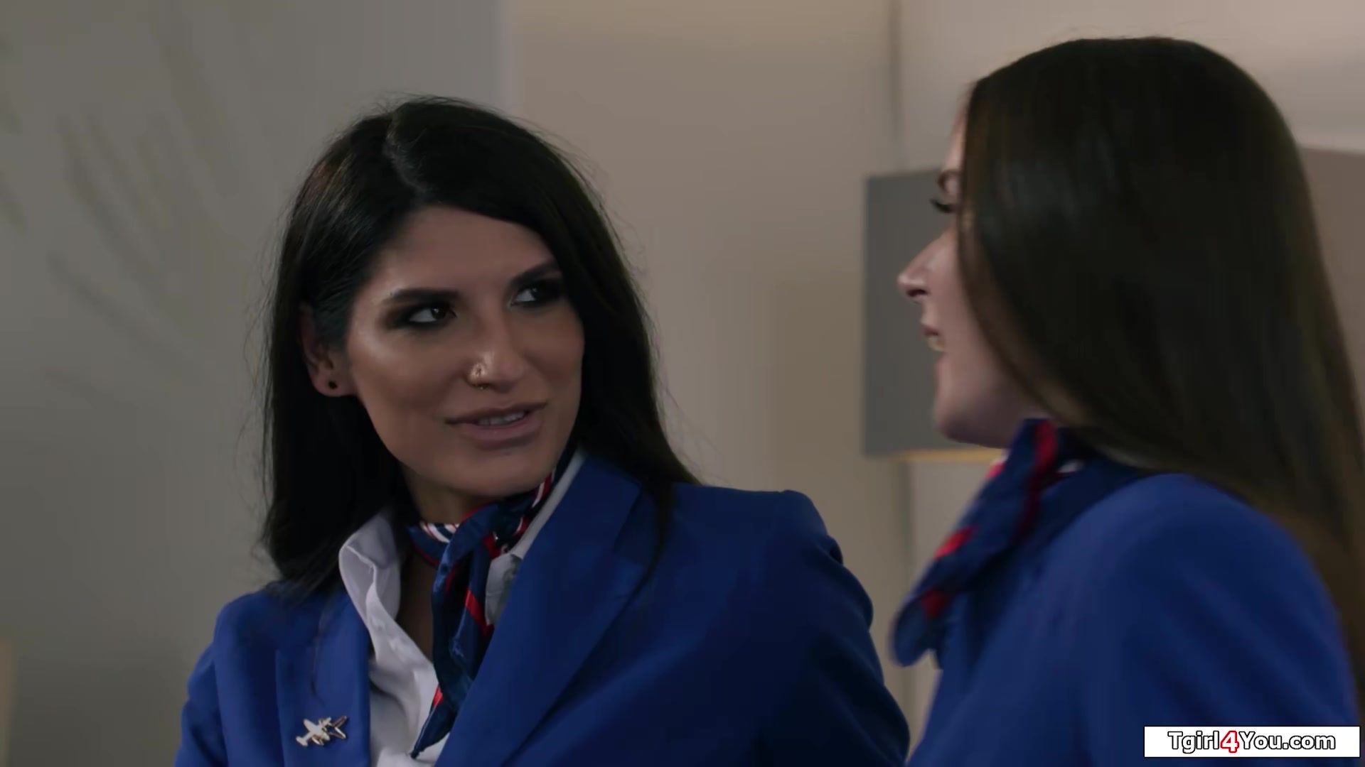 Shemale flight attendant Zariah Aura and her busty colleague Hazel Moore stay the night.The latin tgirl masturbates the brunette while she gets her big cock deepthroated.The small tits tranny licks the big boobs babes hairy pussy and fucks her