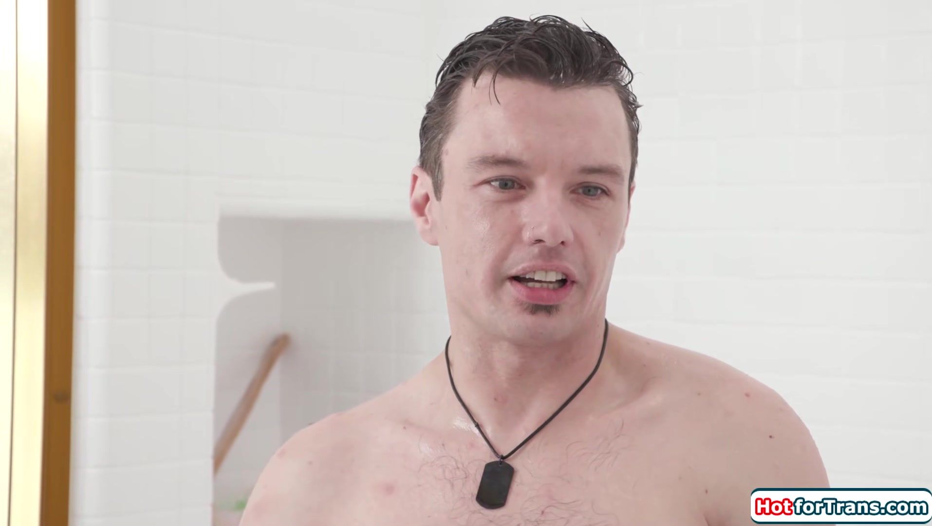 Big tits trans Brittney Kade takes a peek at stepbros friend while hes in the shower.The busty shemale is caught jerking off and joins him.They kiss and the tgirl deepthroats and is anal fucked.The guy rims and sucks the trans before barebacking her