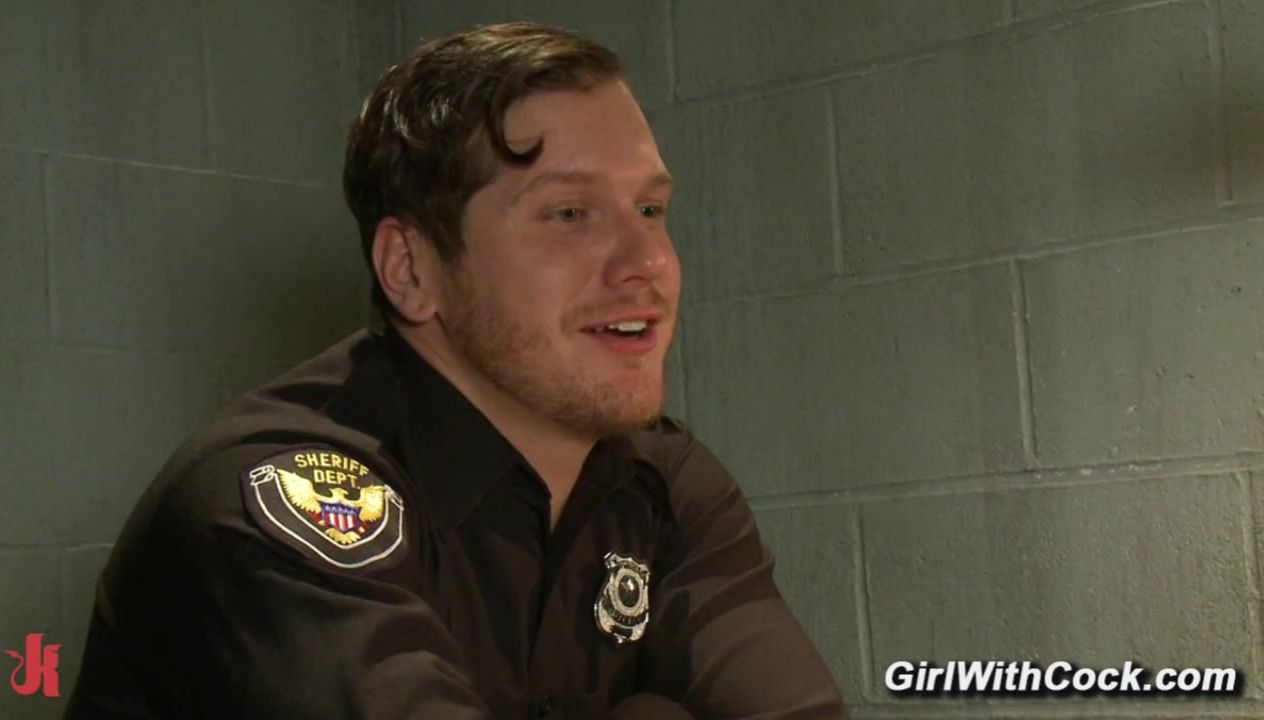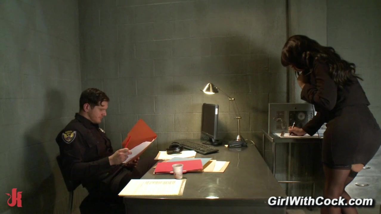Shemale Sunshyne Monroe and Parker London in a wild office fuck in precinct hardcore anal sex aggressive blowjob and passionate pounding on the desk and against the one way mirror