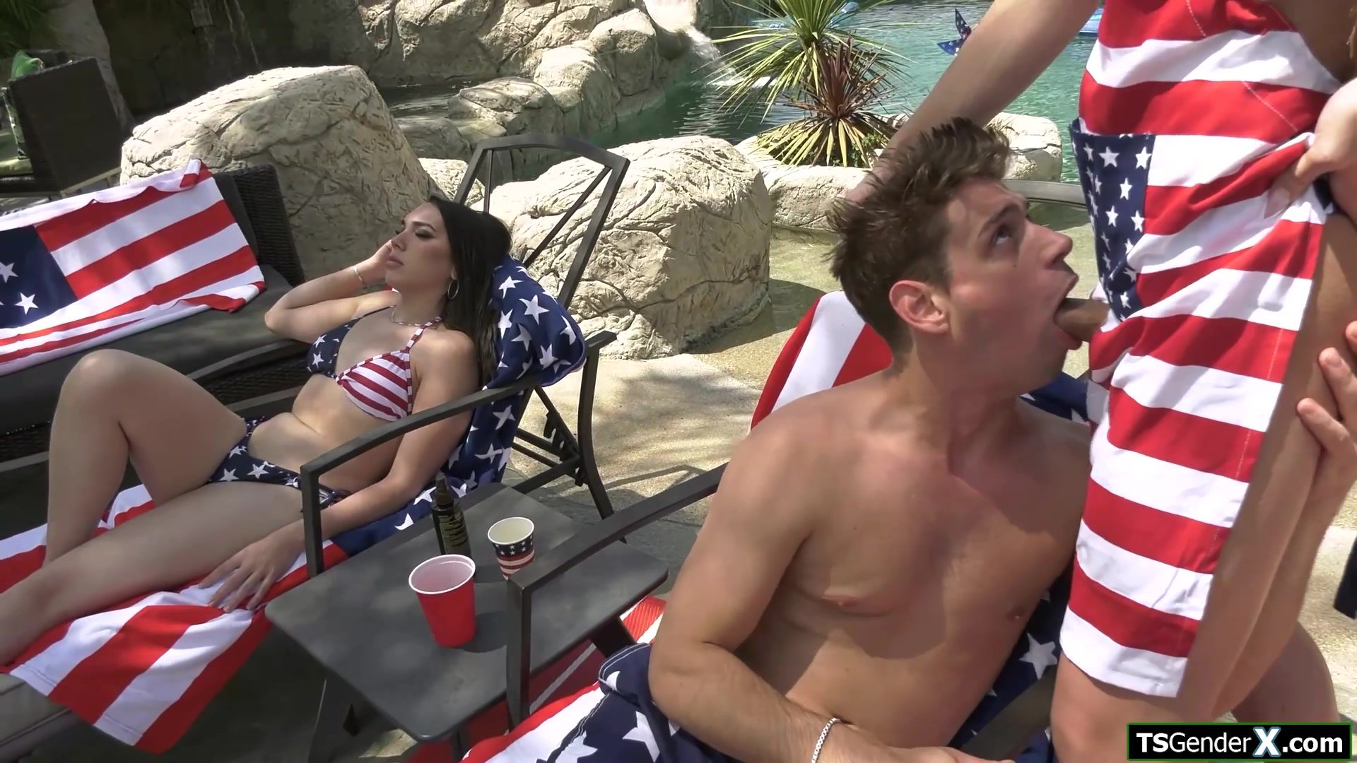 Four hot shemales anal fucked by three guys at a pool party
