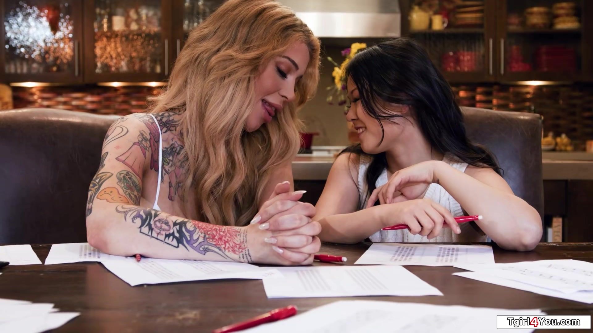 Tgirl teacher Gracie Jane cheats with small tits student Lulu Chu.The big tits shemale puts her homework aside and deepthroat facefucks the petite asian.The tattooed trans licks her pussy and sucks on her boobs while she rides her tranny dick