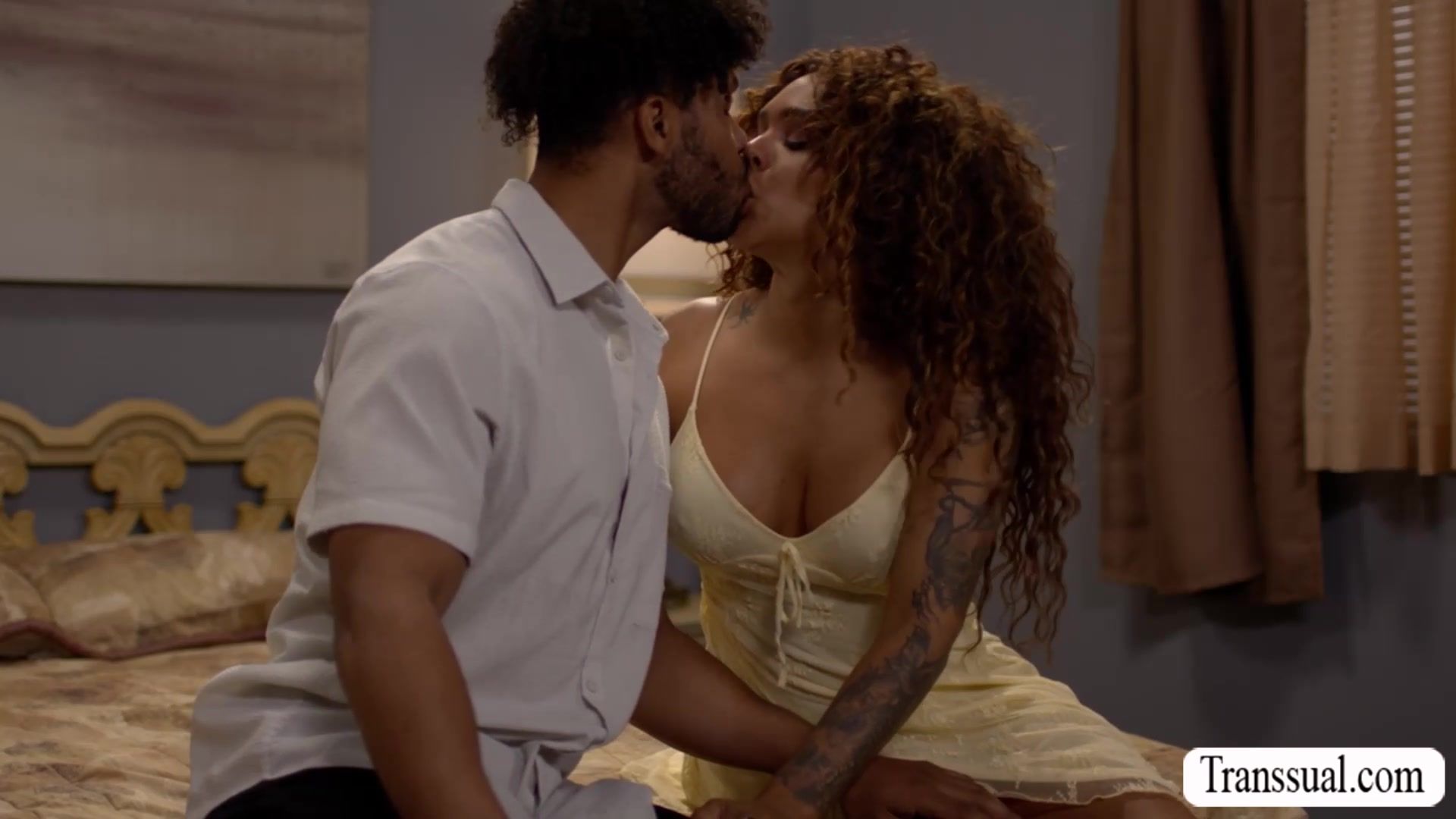 Latina curly TS Eva Maxim is on the bed waiting for Tony Genius to arrive.After hes arrival,they kiss each other and she then throats his hard big cock and in return,he bareback fucks her ass so hard.Go to Transsual.com for more like this.