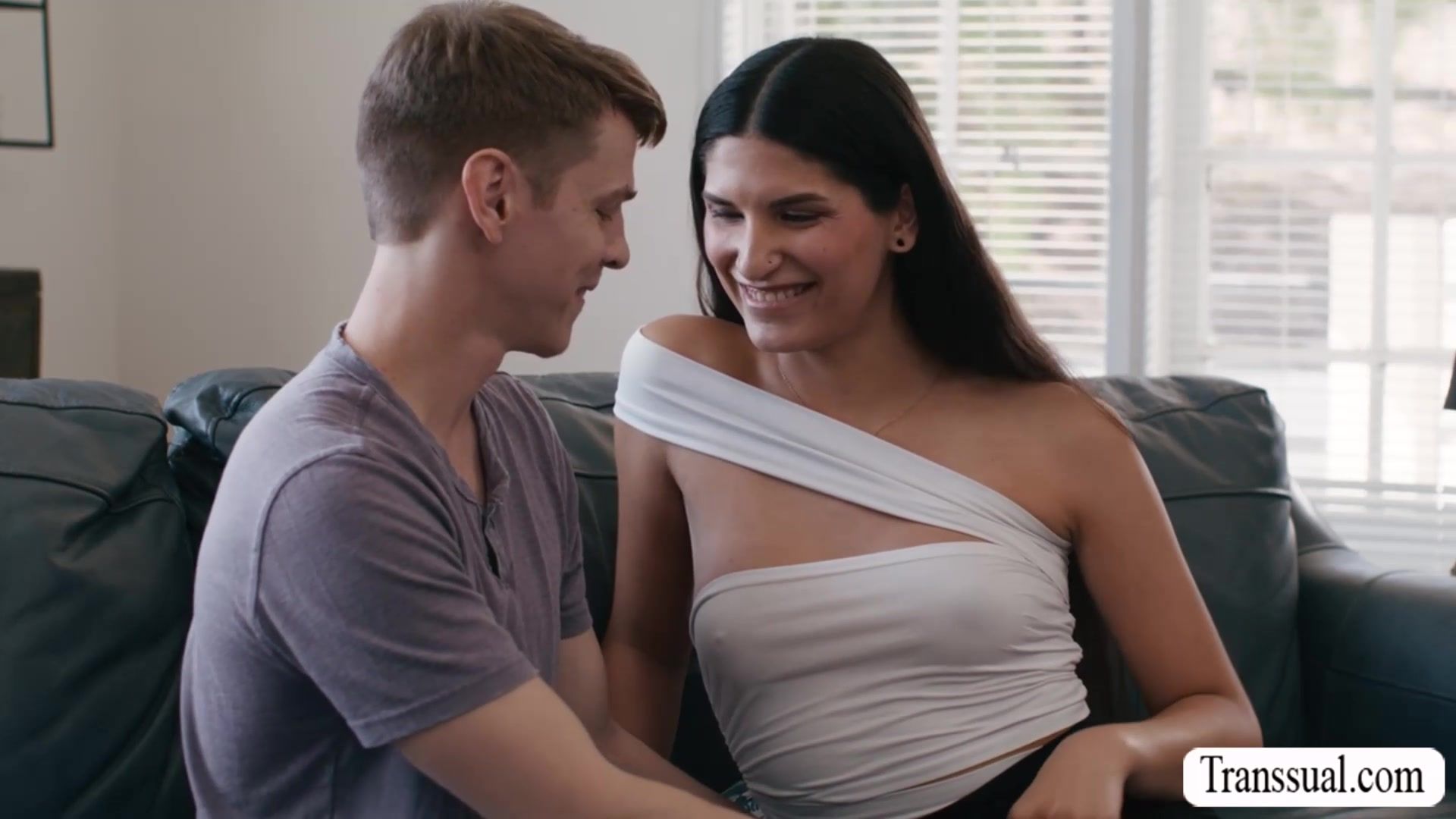 Twink Sage Roux and shemale Zariah Aura are sipping coffee on the couch.After that,they get horny and start kissing each other.Sage starts sucking Zariahs shecock and lets her fuck his tight ass so hard.go to Transsual.com for more exclusive videos.