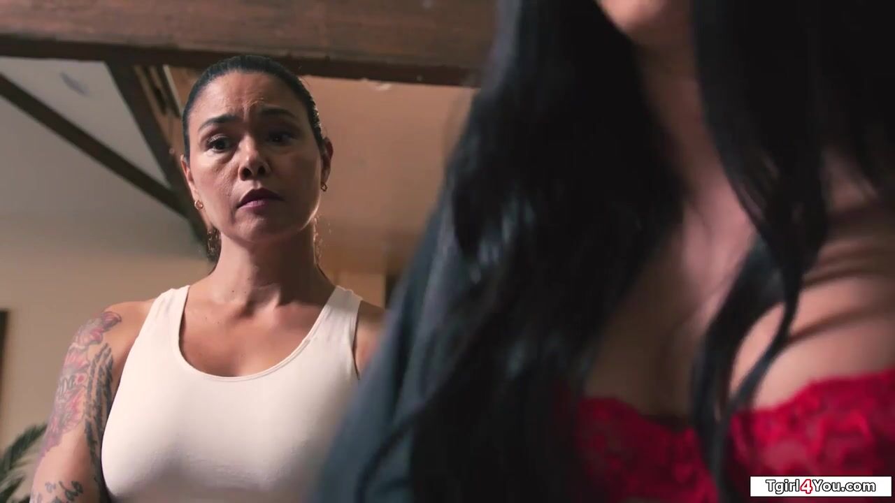 Big-titted trans Khloe Kay opens the door for woman plumber Dana Vespoli dressed in nothing but gorgeous undergarments.The yam-sized titties tranny has puss on her mind
