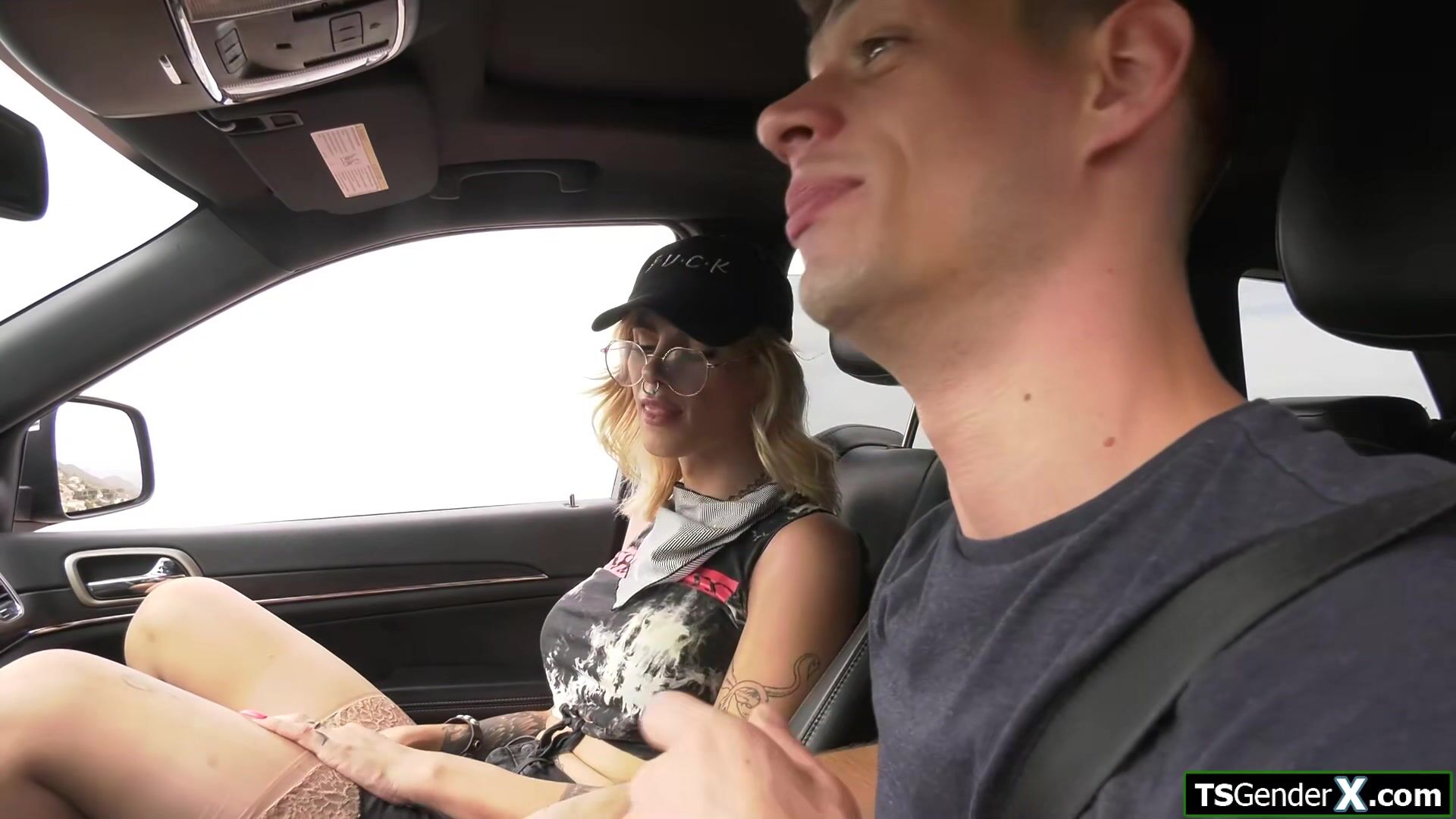 Picked up horny shemale hitchhiker Dahlia Crimson today and she wants to fuck.The big tits tgirl deepthroats the guys cock while being jerked off.The blonde tattooed pierced trans gets her own tranny dick sucked off before she is anal barebacked