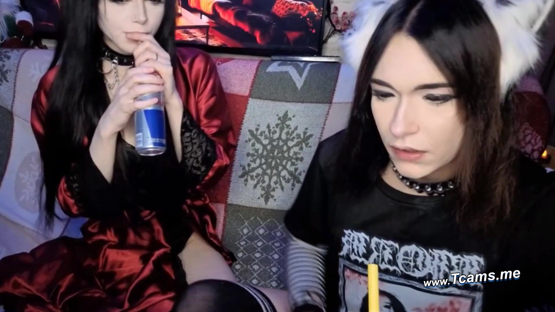 In a cozy room lit by a TV screen, a stunning babe in a shiny red satin dress lounges seductively on a patterned couch next to a gorgeous transwoman in a black metal band T-shirt and striped sleeves, accessorized with a choker. The transwoman playfully points at the camera while the babe leans in close, their long dark hair cascading. This captivating duo performs on a live webcam show via tcams.me, teasing viewers with intimate moments. Later, the transwoman reveals her feet for playful interaction, as the babe toys with them sensually, building to an erotic climax where she eagerly licks and rims the transwoman's ass