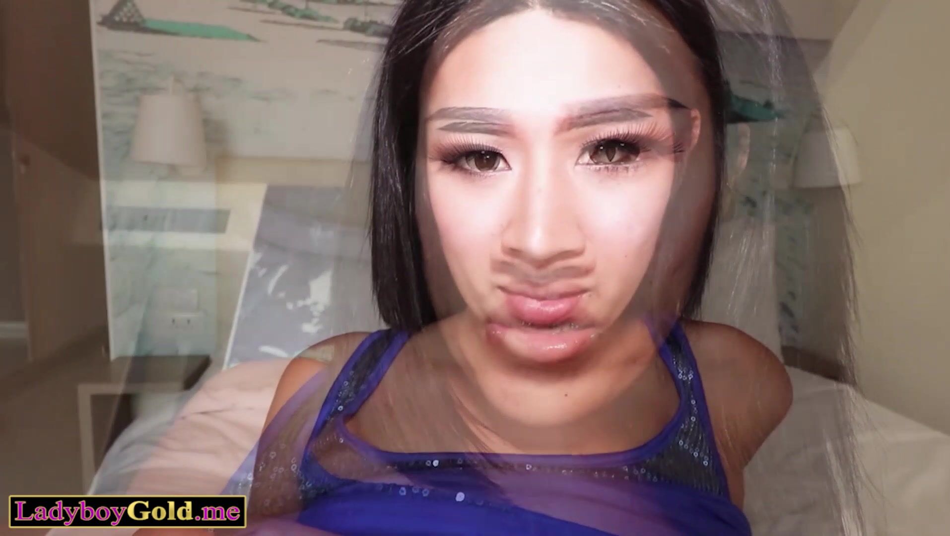 Smiling amateur Thai ladyboy teen Nim with small tits takes off her lingerie and spreads her ass wide open to make a farangs horny and get his big white cock She gets on her knees and sucking the throbbing dick then hops onto it for a bareback ride