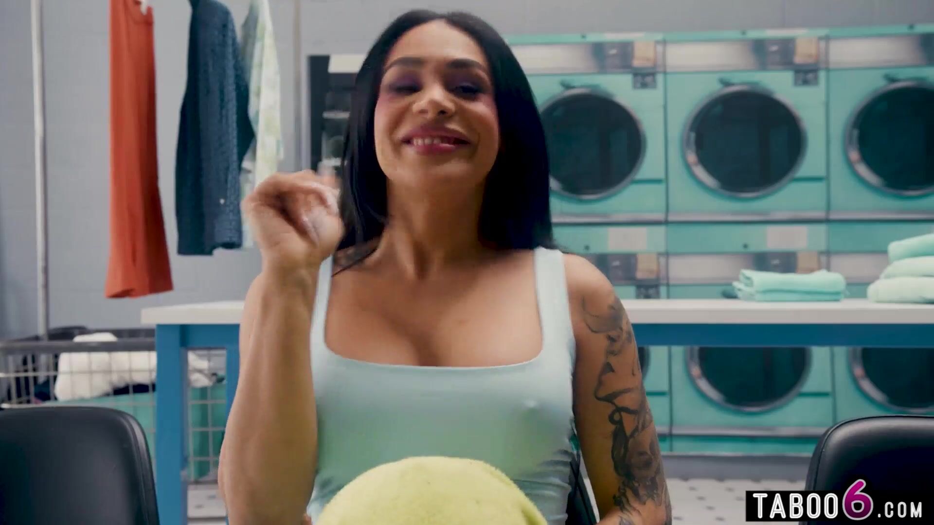 Laundromat three way with 2 buxom nymphs and a steamy transgender princess