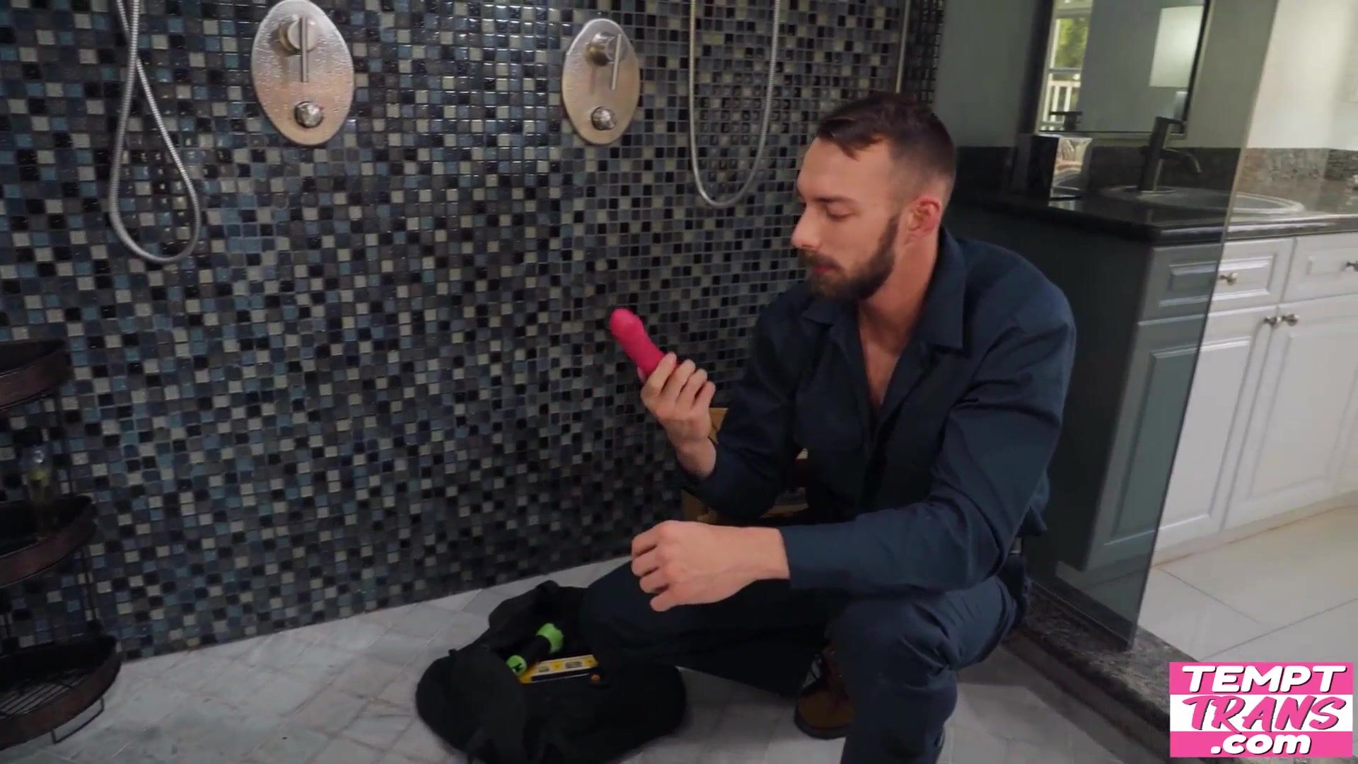 Plumber Catches a Peek of the Pretty Rosy Ass Ass-plug Inserted into Trans Bootie
