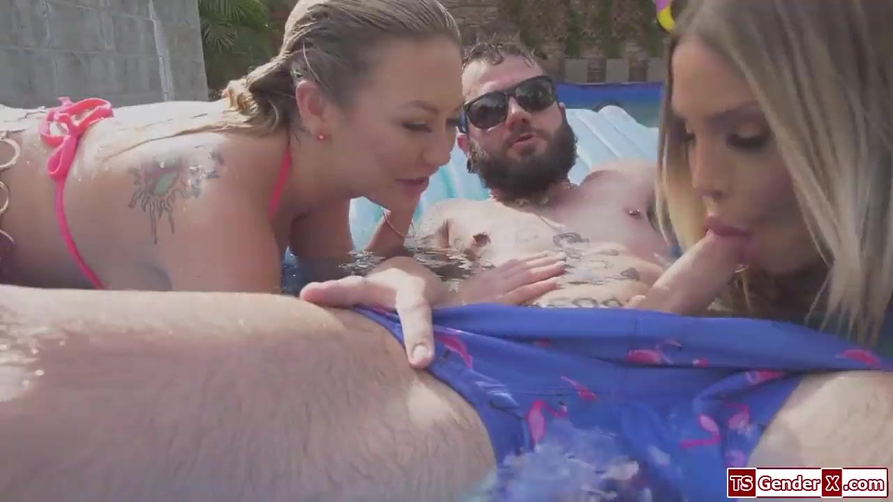 TRANSSEXUAL Jade Venus and three tgirls get barebacked in pool soiree fuckfest (Ka...