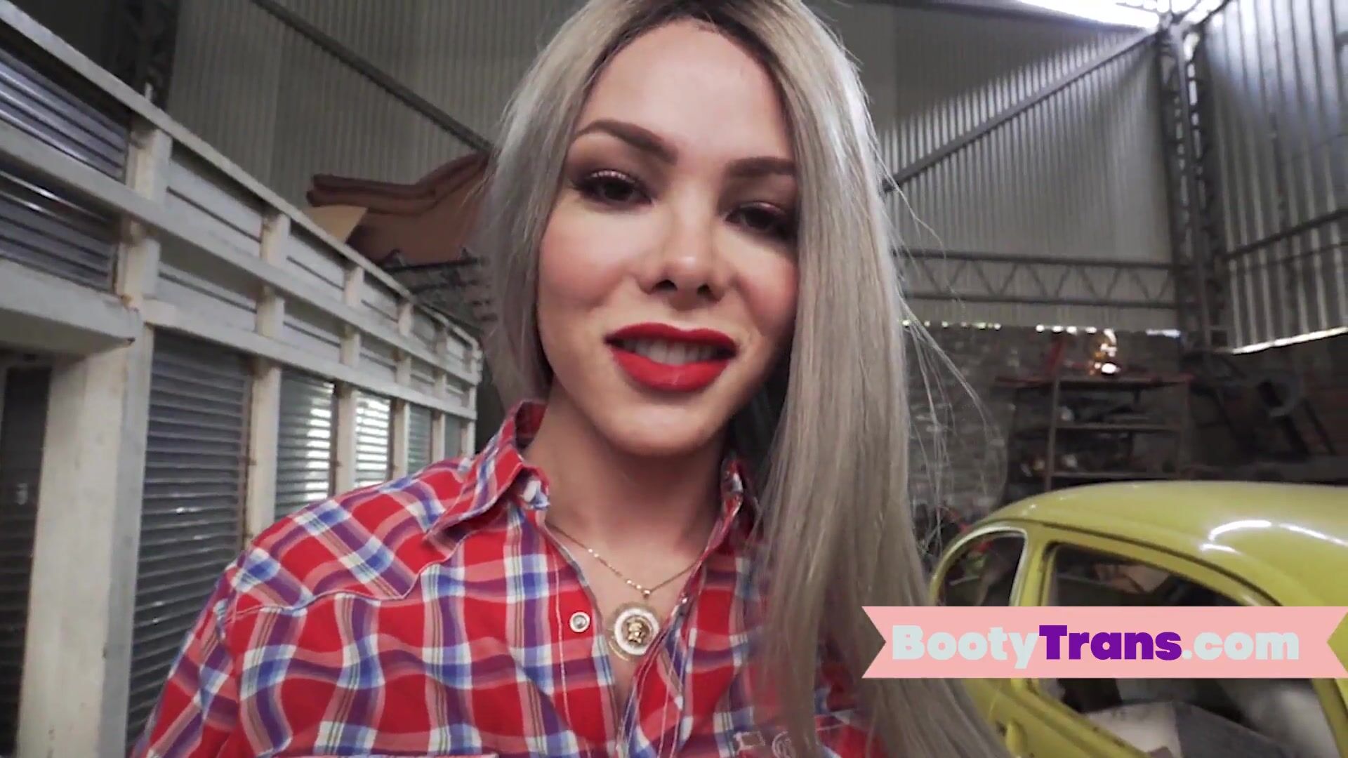 Curvy transsexual honey gets arse measured by mechanic before sucky-sucky