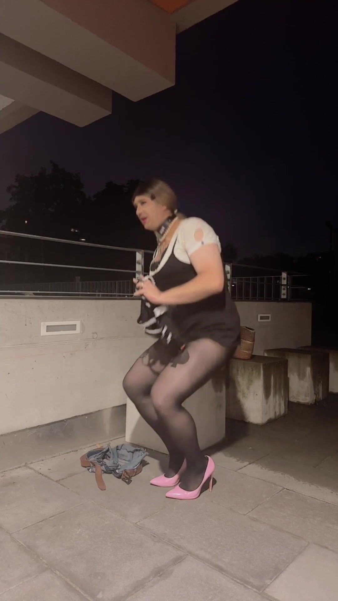 Sissy outside fuckbox and rump pluged and bang faux-cock