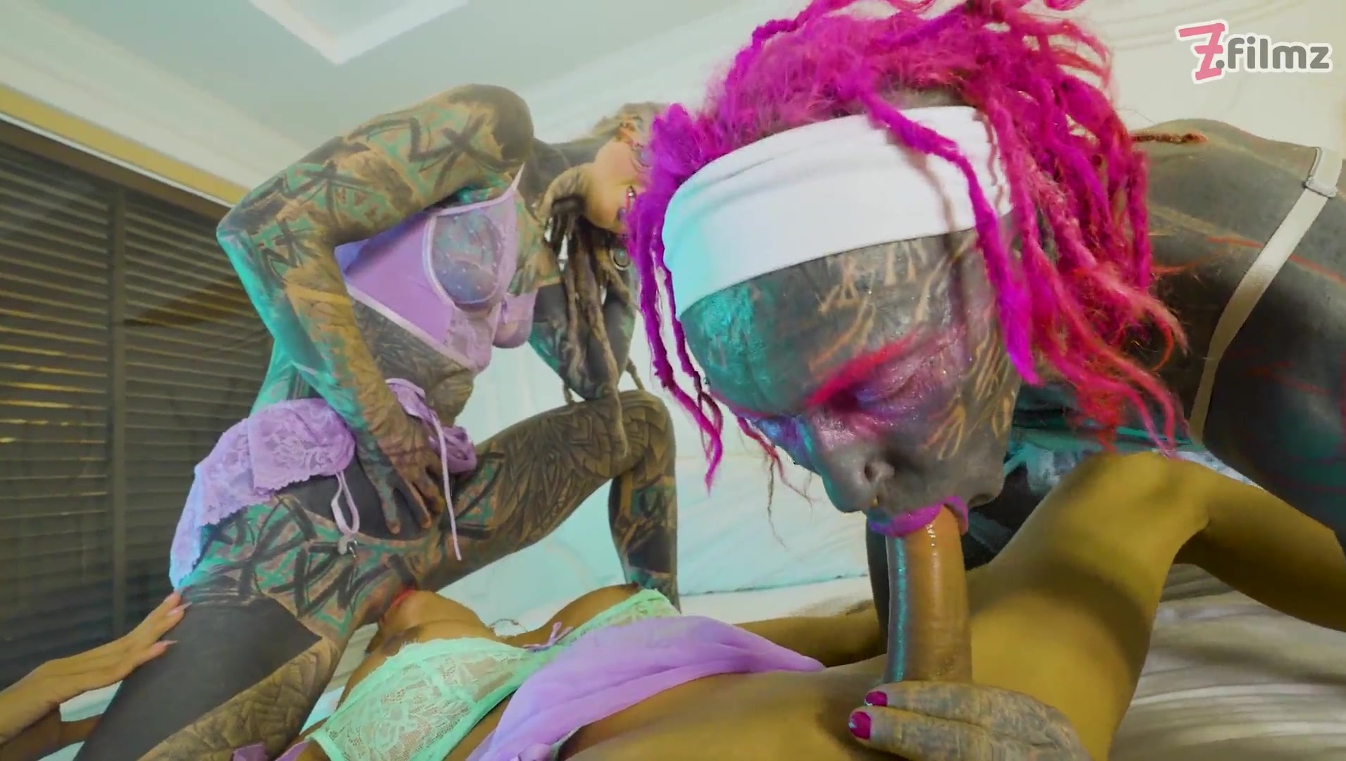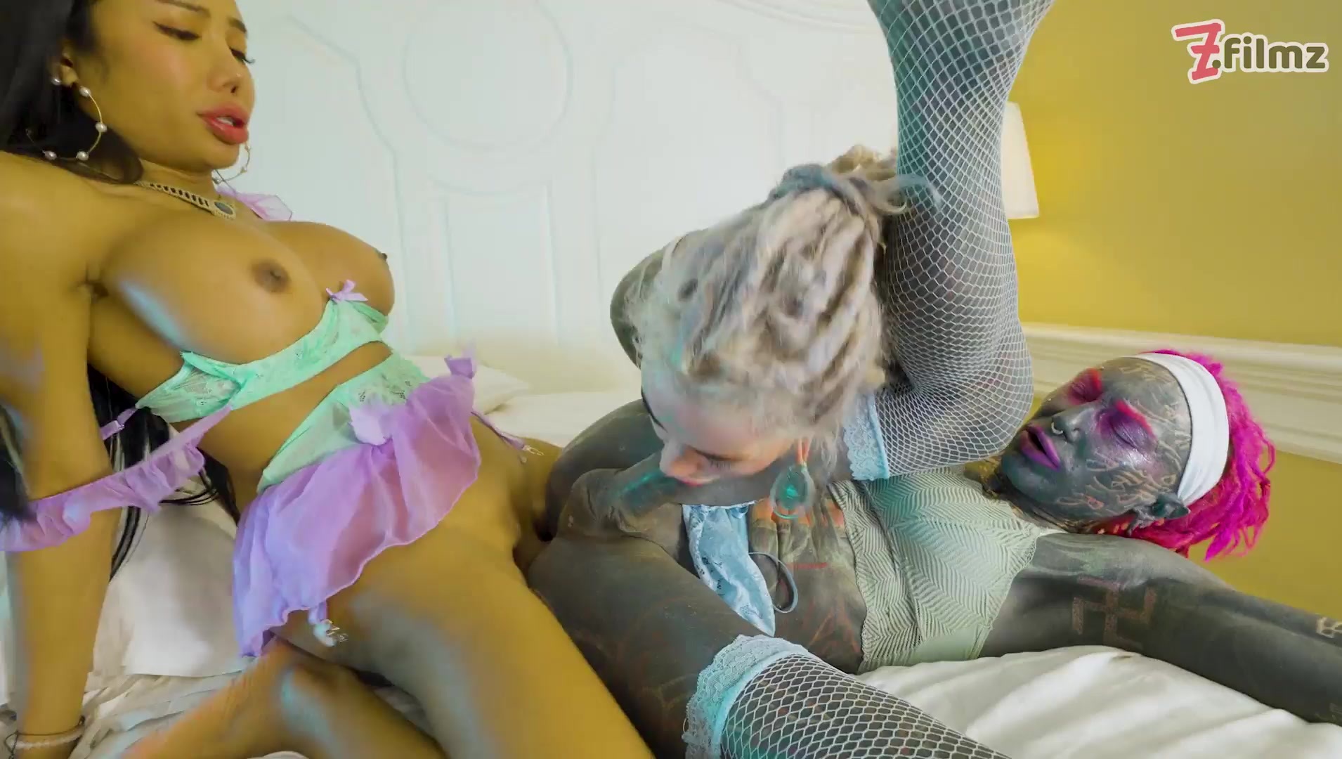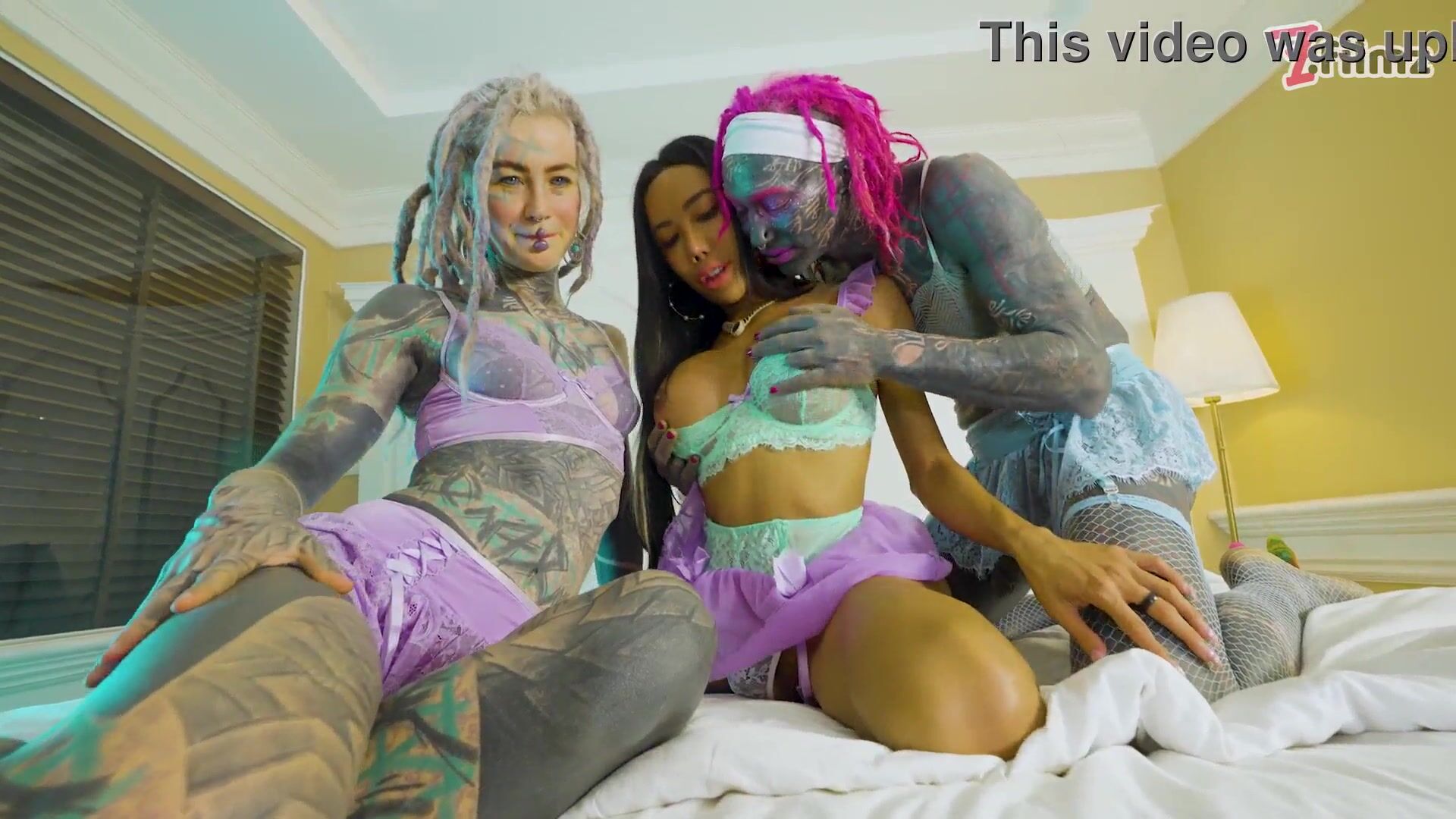 Wide open Dual Buttfuck Three-way with tat Chick and 2 She-male tramps - Facial cumshot & ASS TO MOUTH