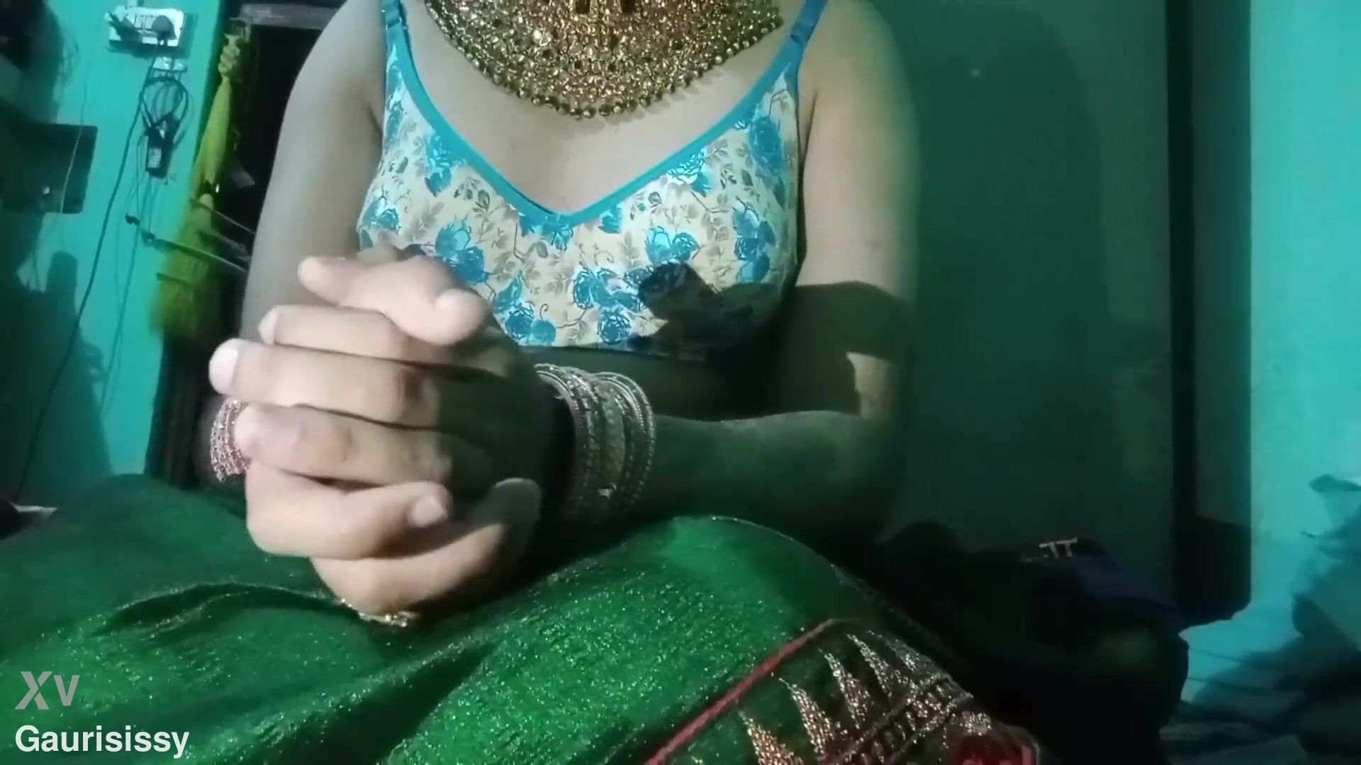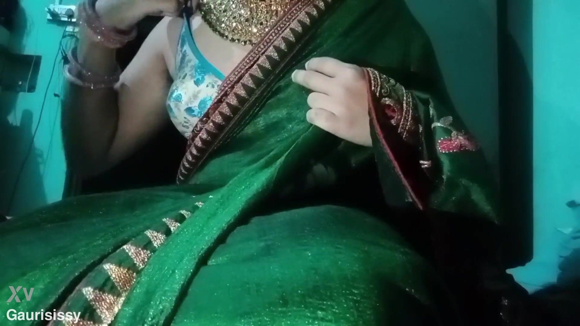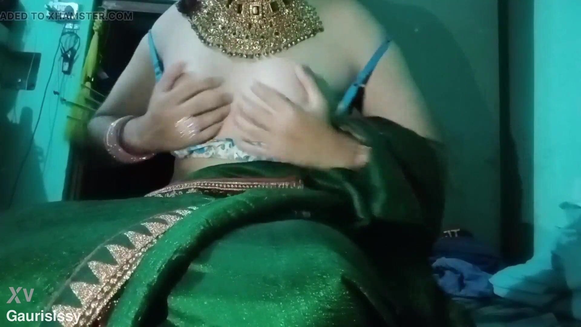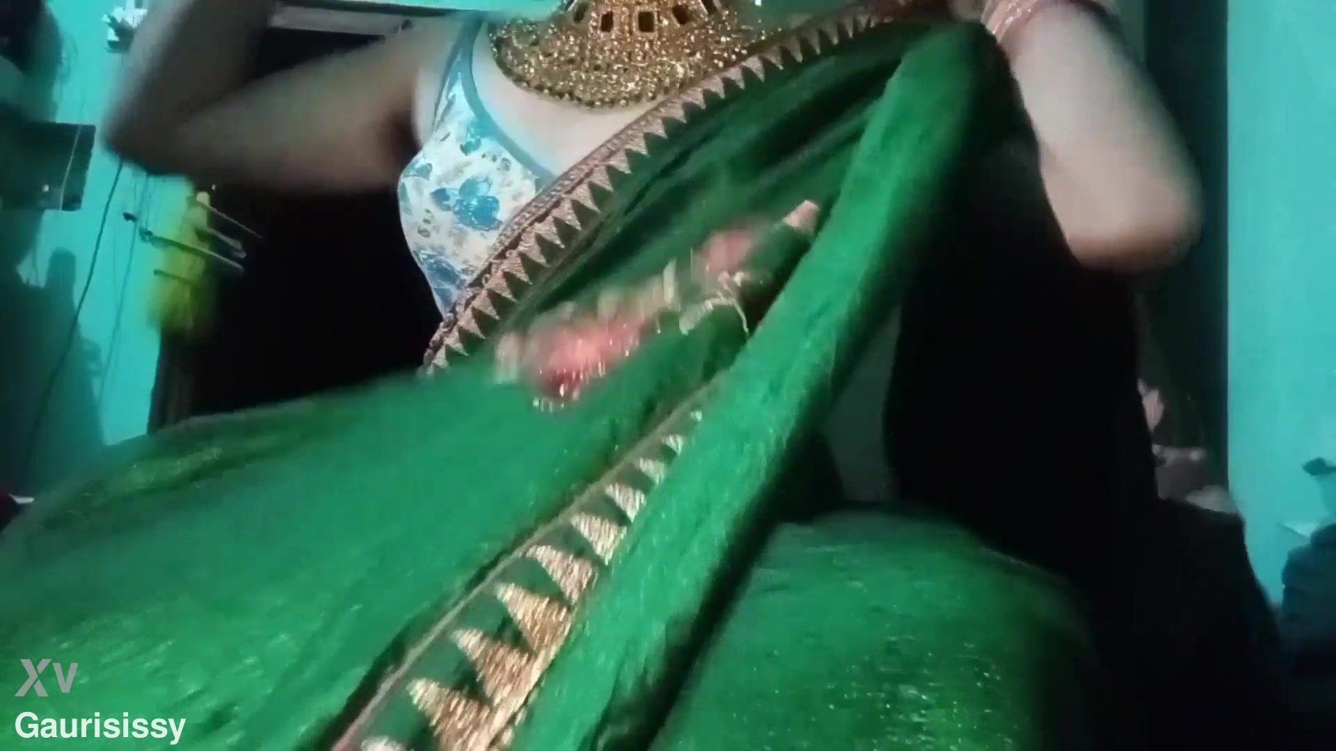 Indian Batty boy Bottom Crossdresser Gaurisissy pressing his baps so stiff with strong jwellery in green Saree real hardcore bang-out